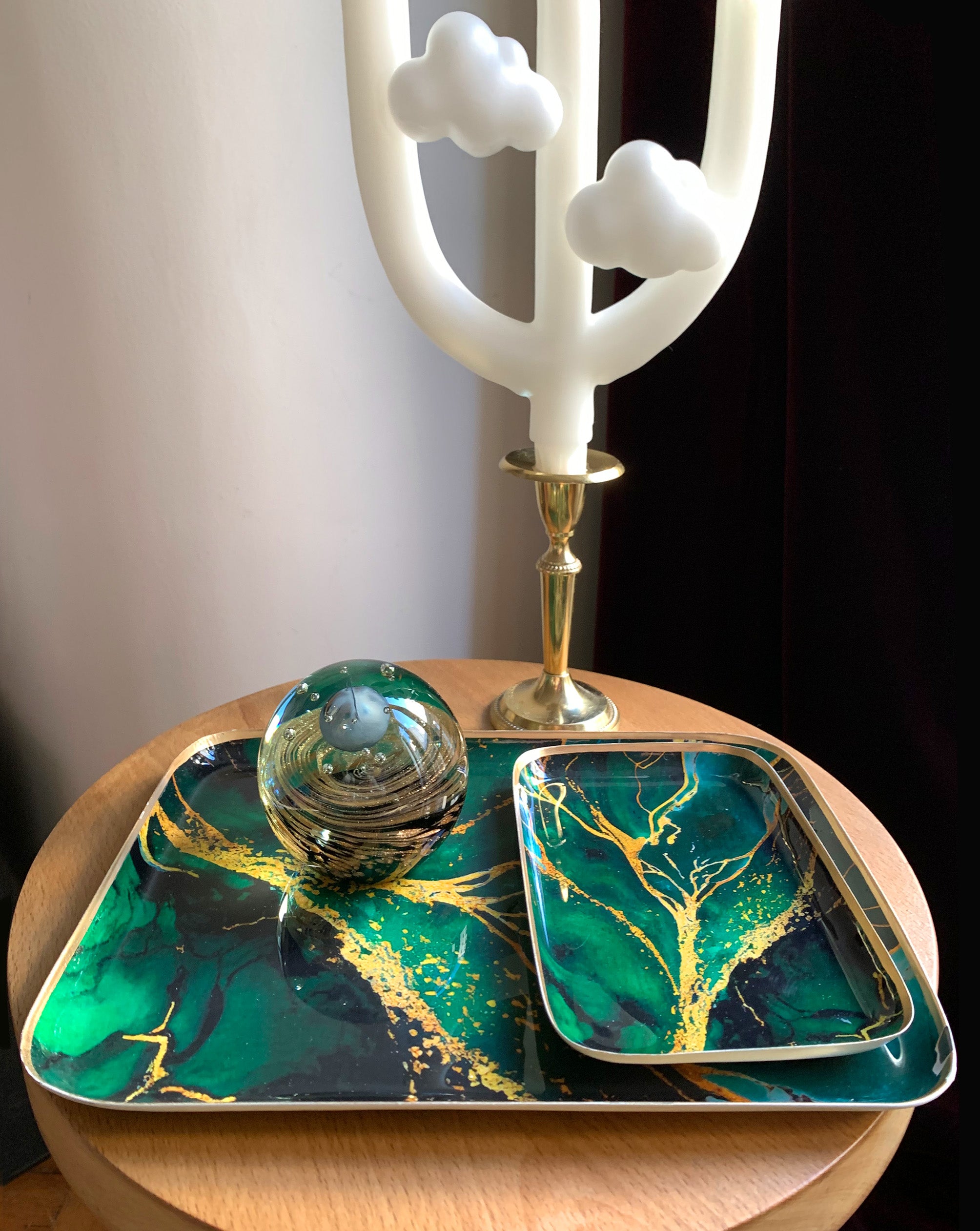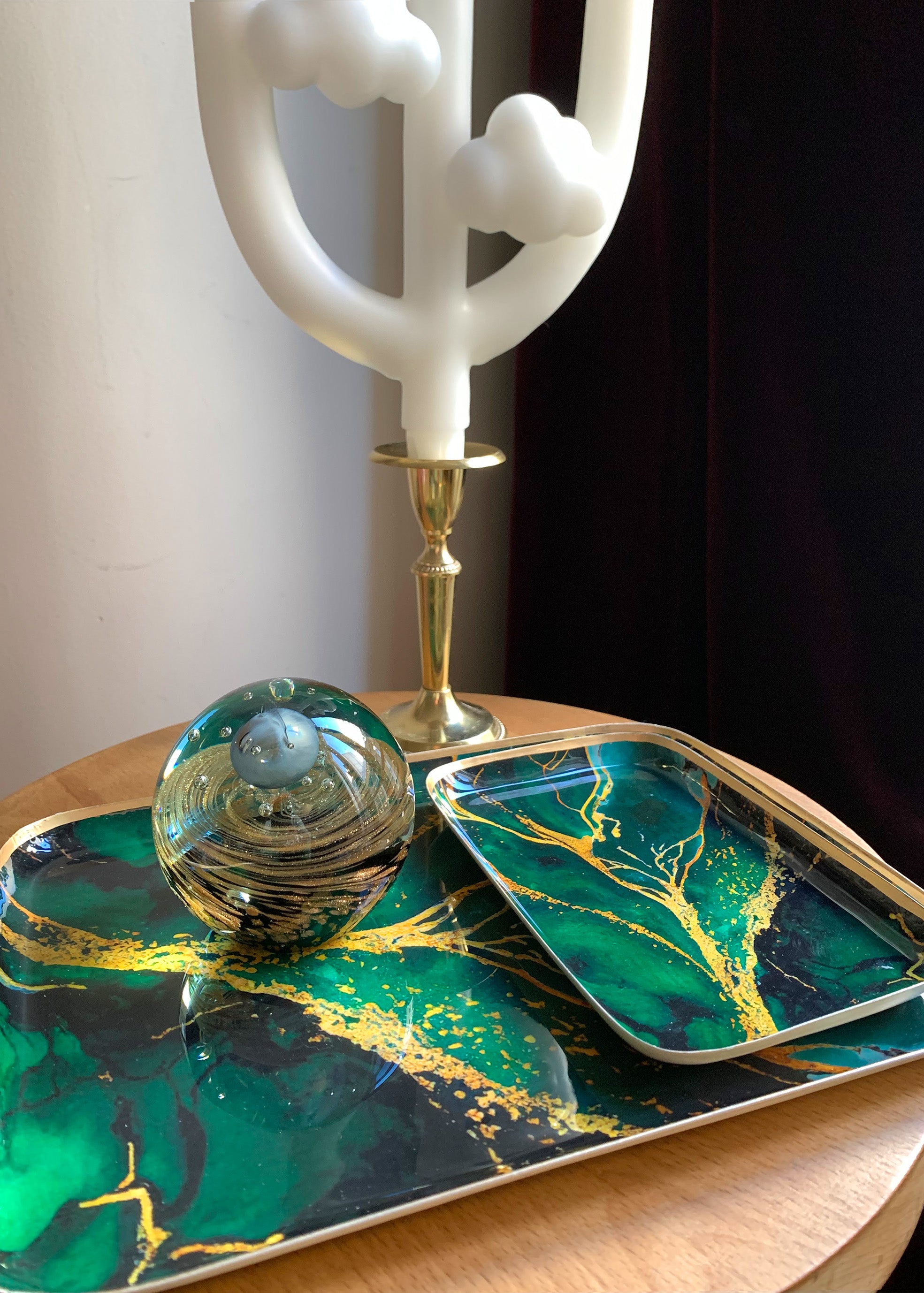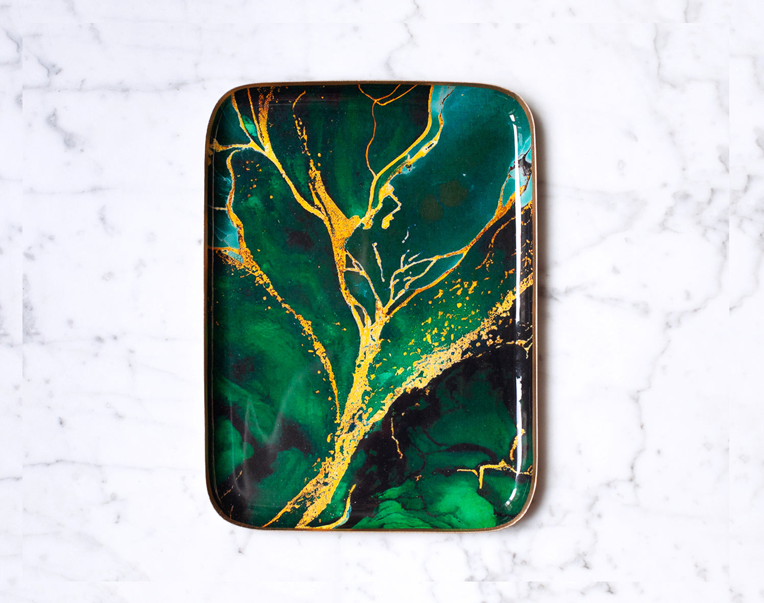 Petit plateau à fond vert émeraude marbré et veiné d'or, évoquant le delta du fleuve Amazone.