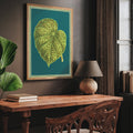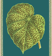 Illustration de feuilles de Begonia sur fond bleu canard. On peut trouver cette plante dans toutes les régions tropicales du globe à l'exception de l'Australie. Certains bégonias sont cultivés pour leurs feuillages décoratifs, mais nombreux sont ceux qui sont cultivés pour la beauté de leurs fleurs.