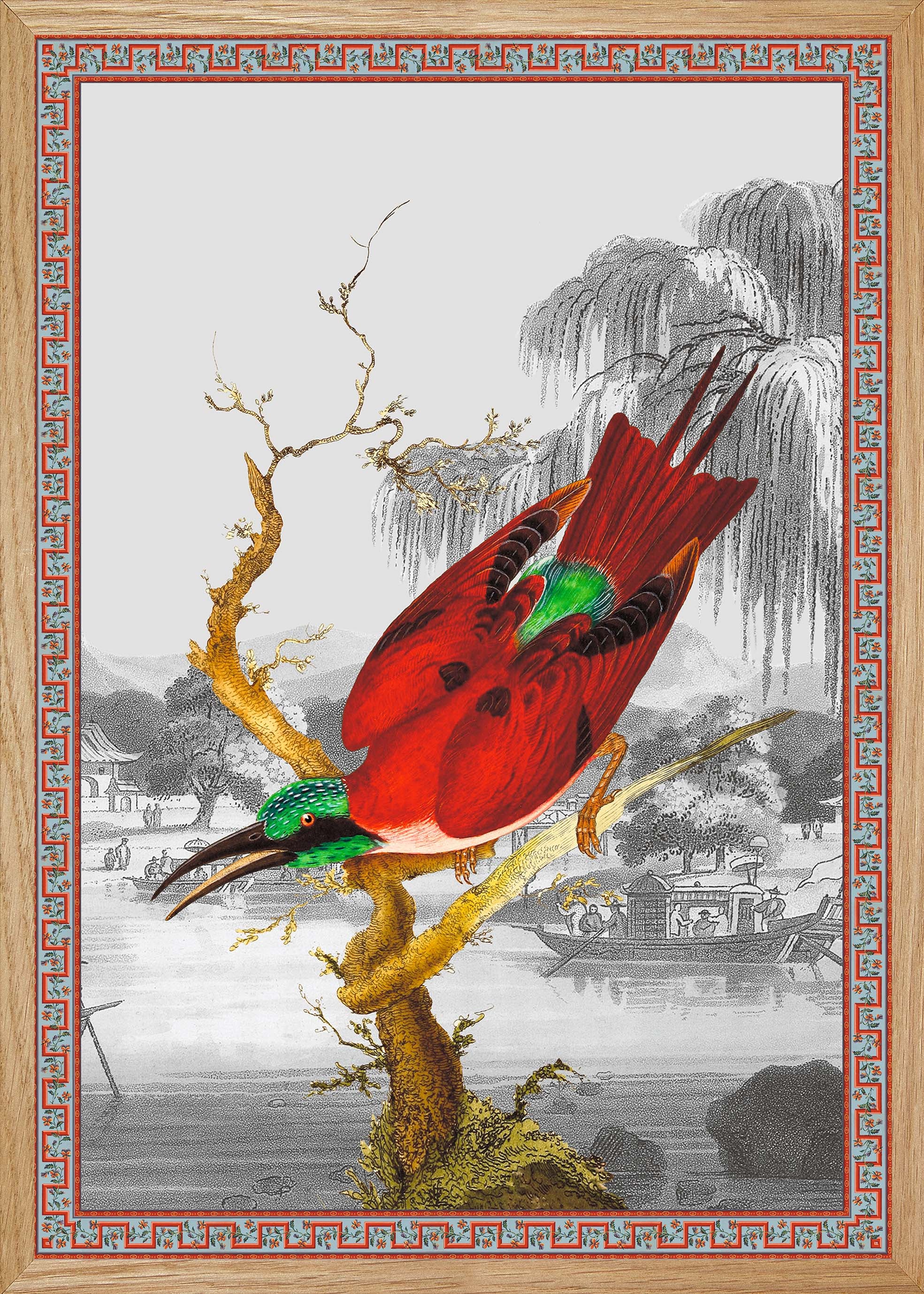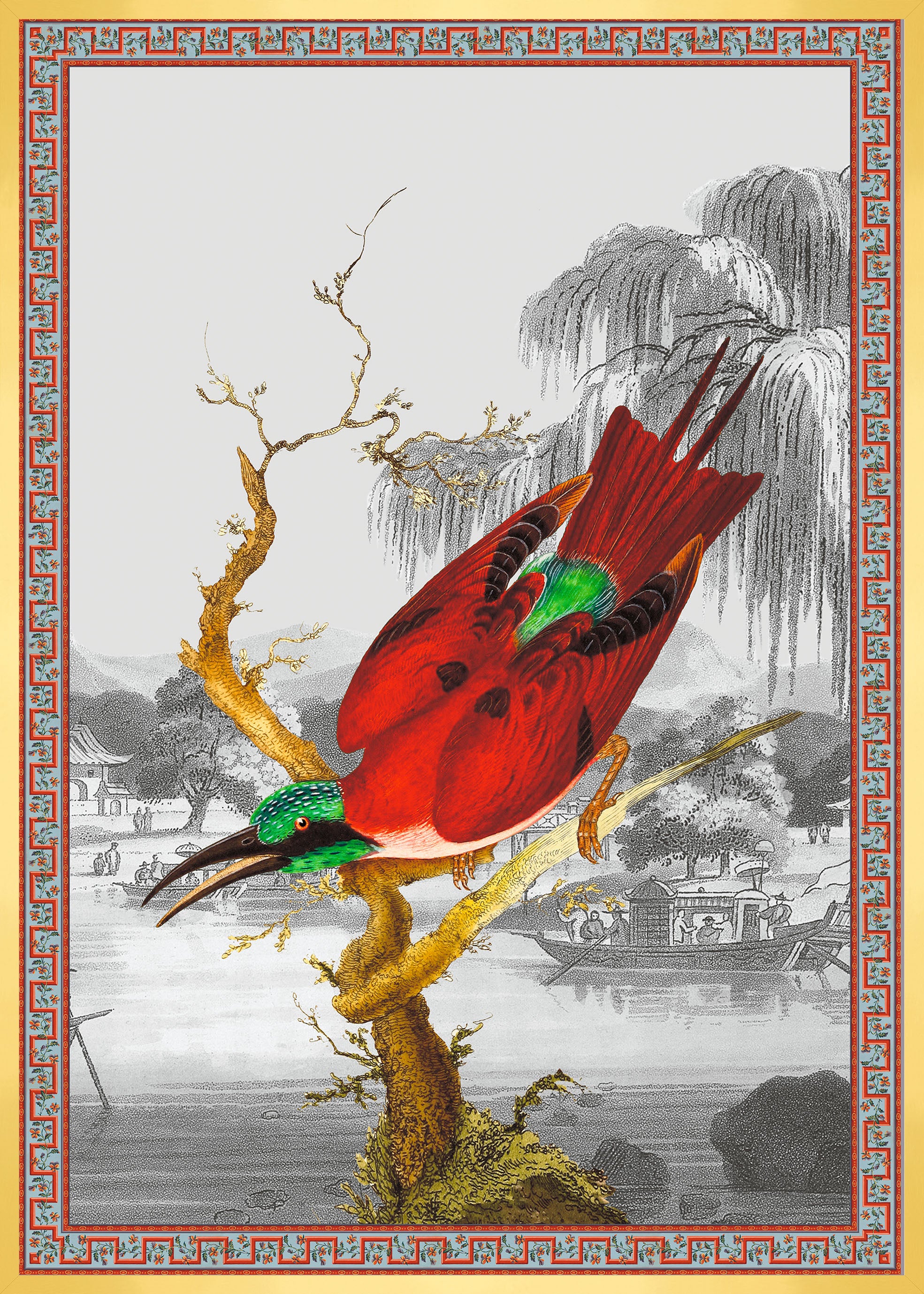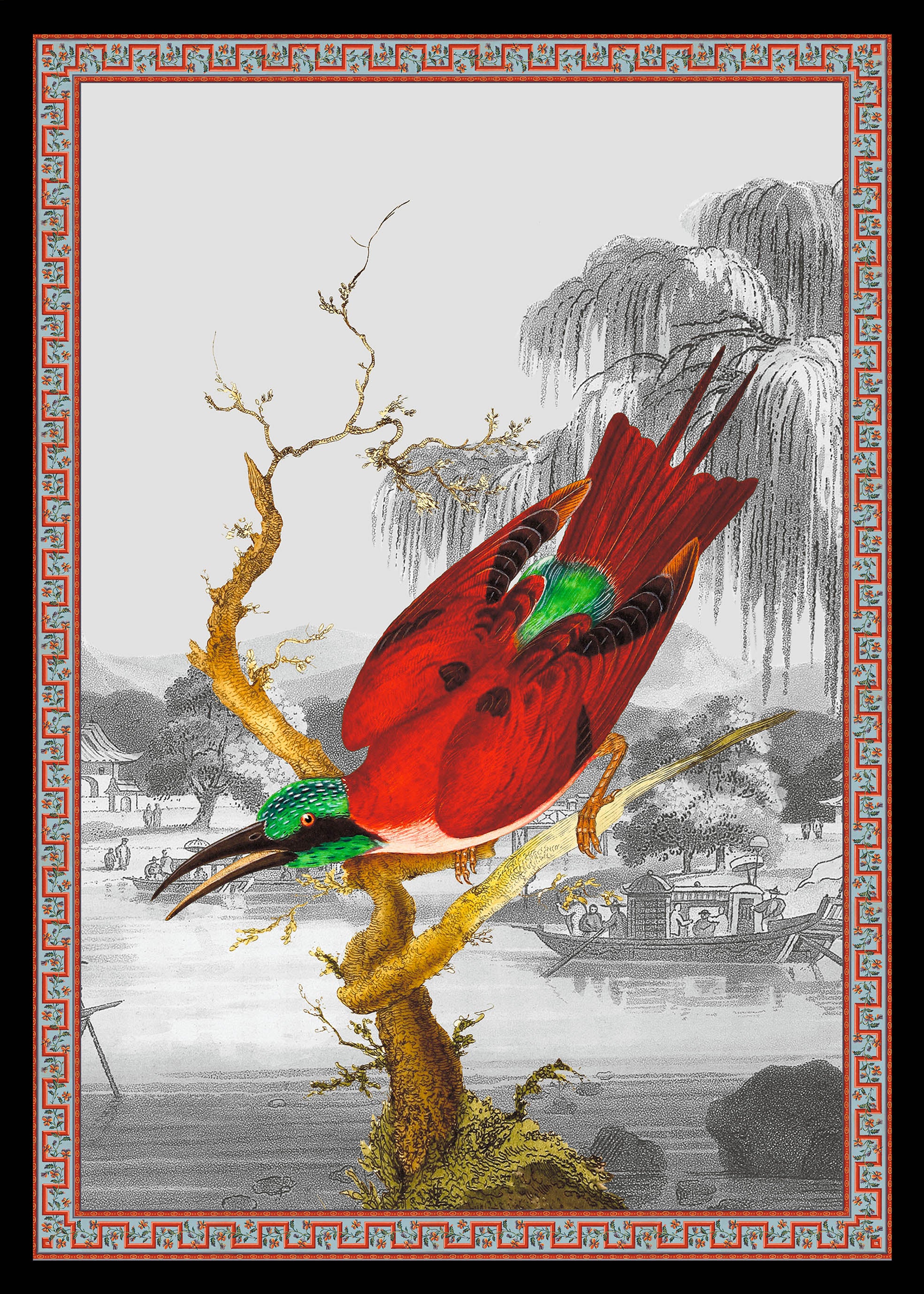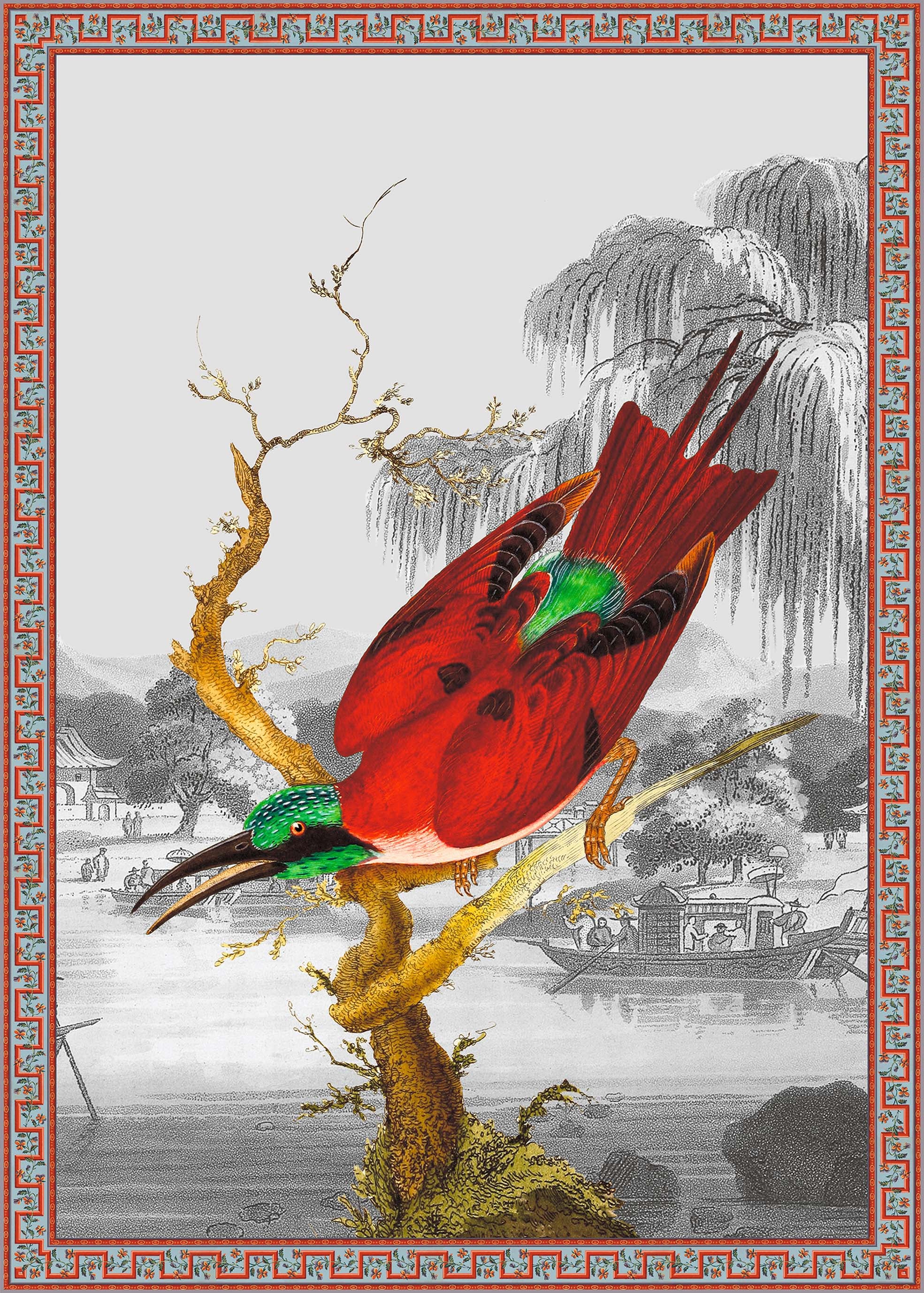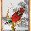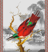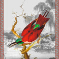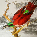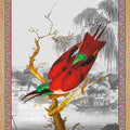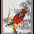 Illustration d'un oiseau Cardinal aux allures japonisantes et au plumage rouge et vert émeraude. Le nom de Cardinal se réfère aux vêtements rouges des cardinaux catholiques.