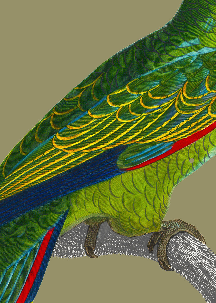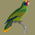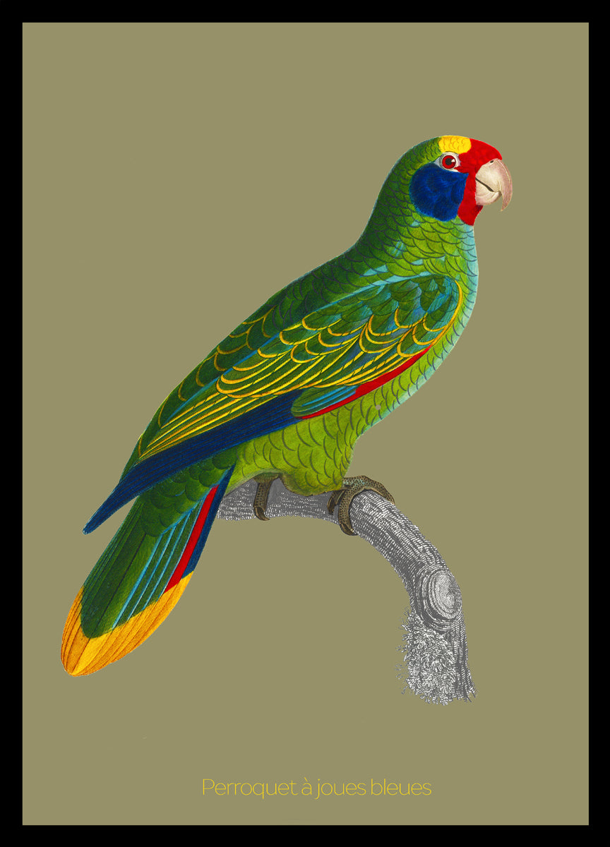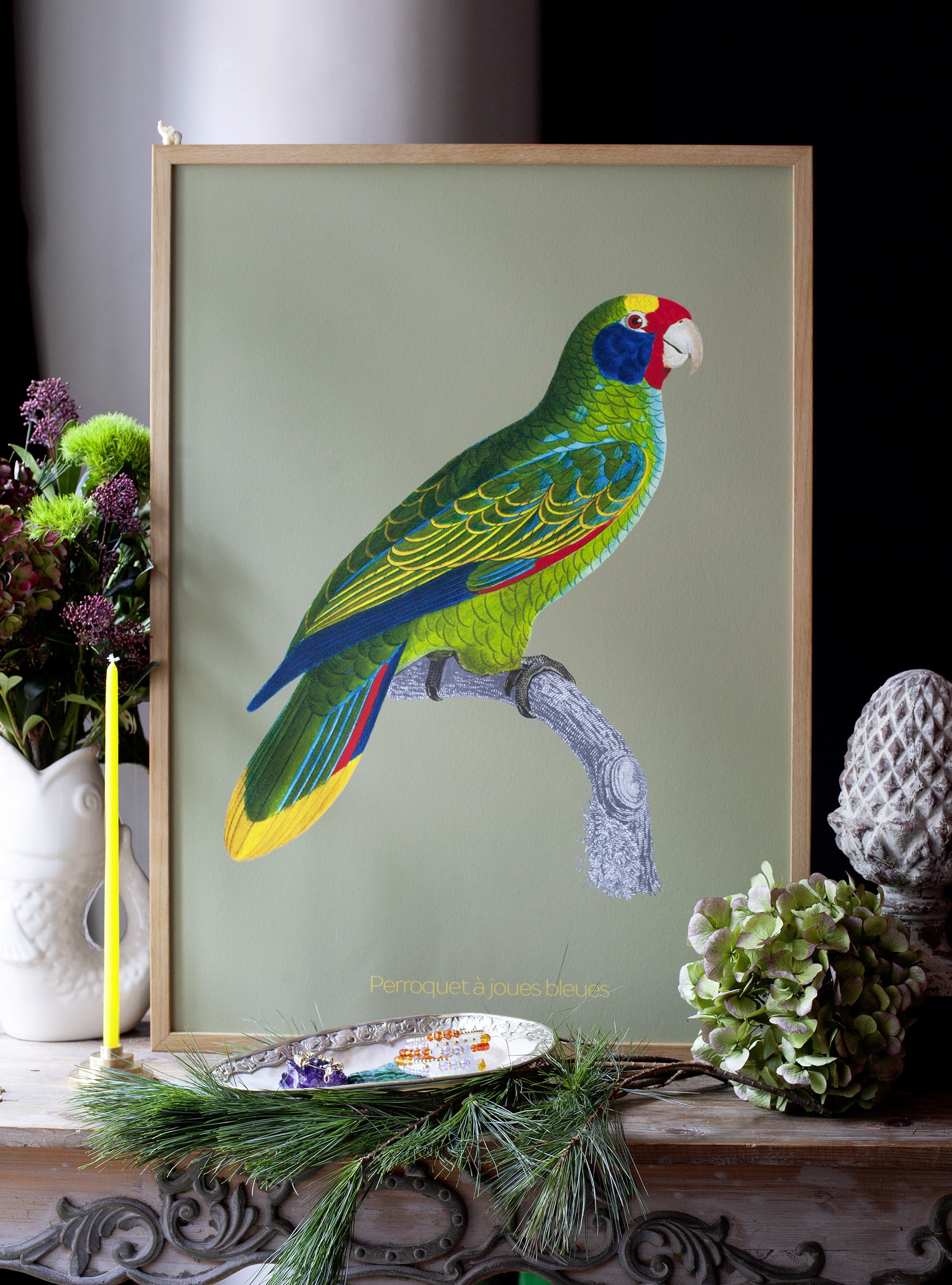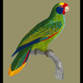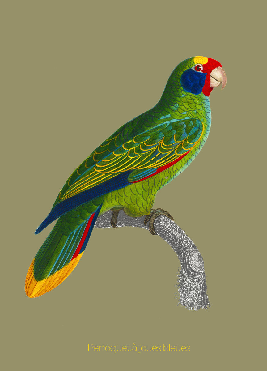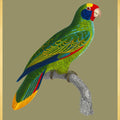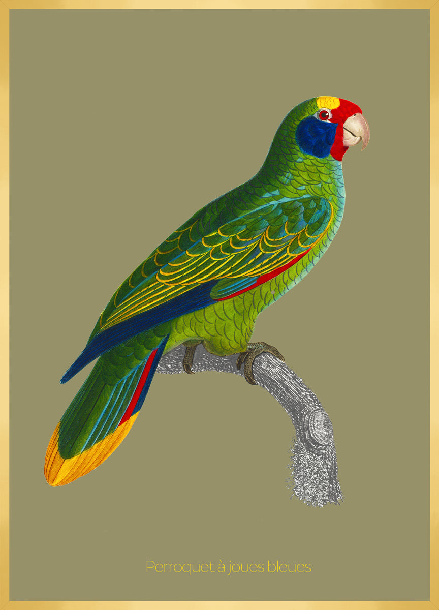 Illustration d'un perroquet à joues bleues aux multiples couleurs et aux ailes bordées d'or.