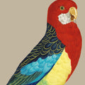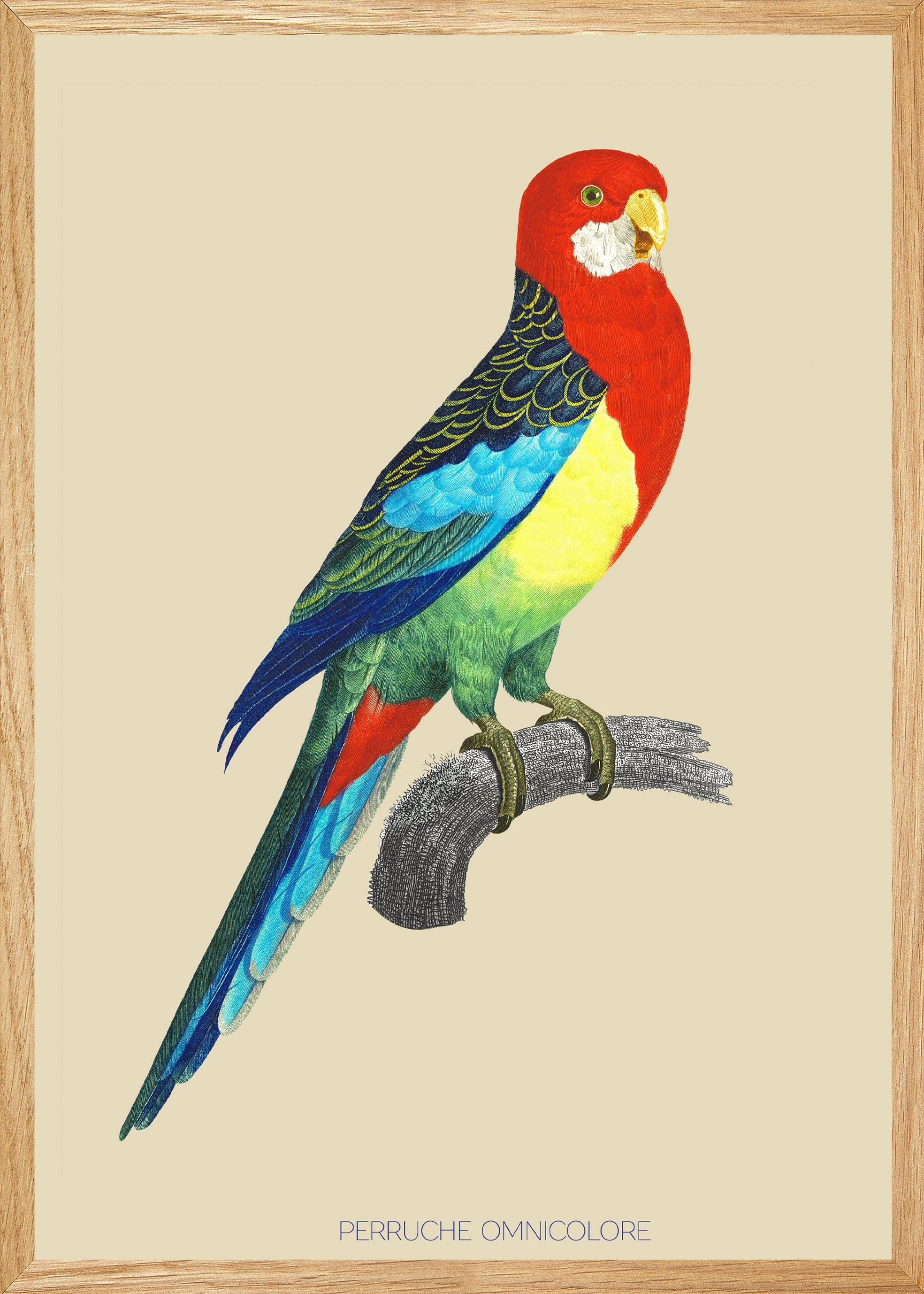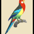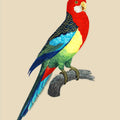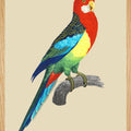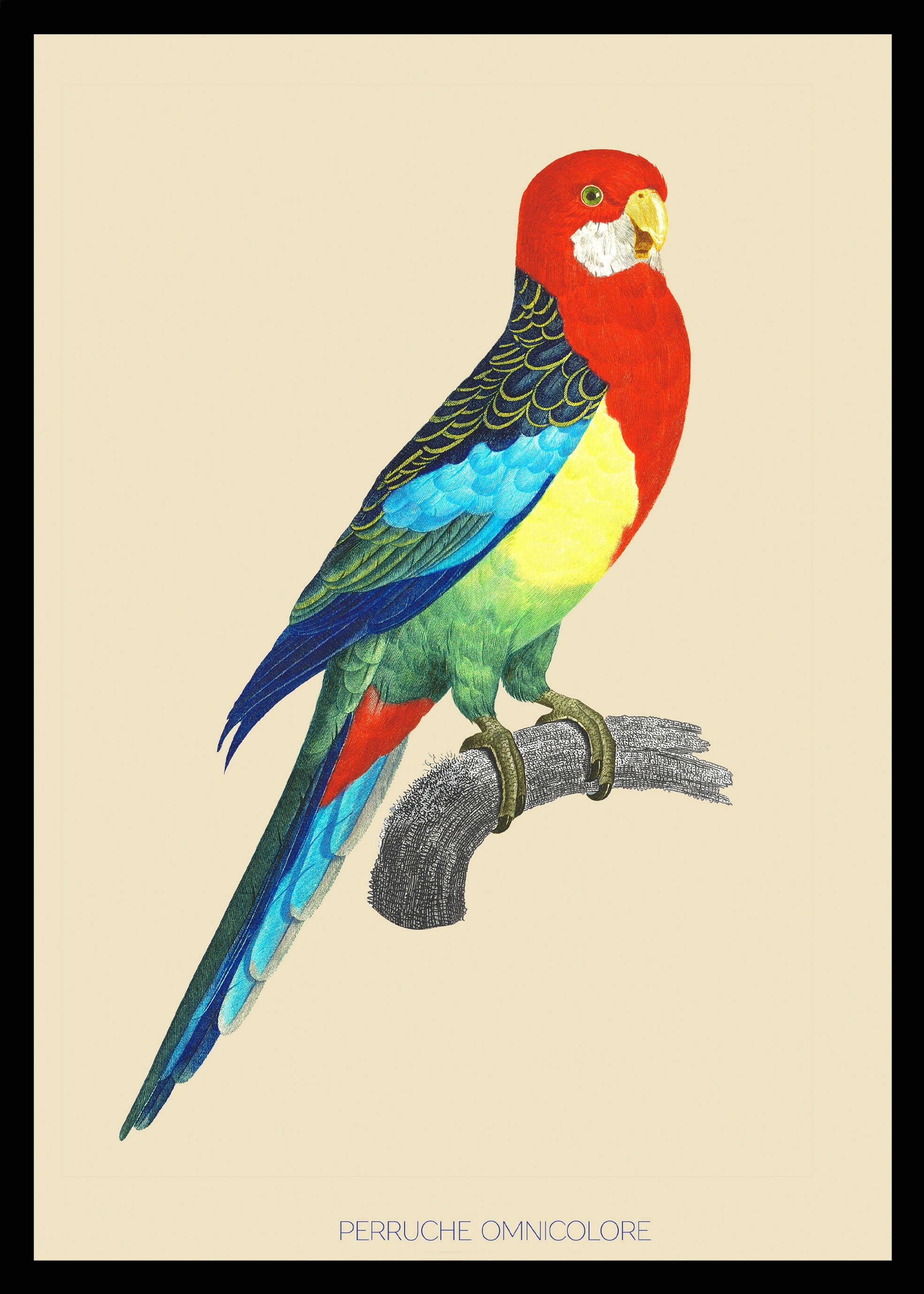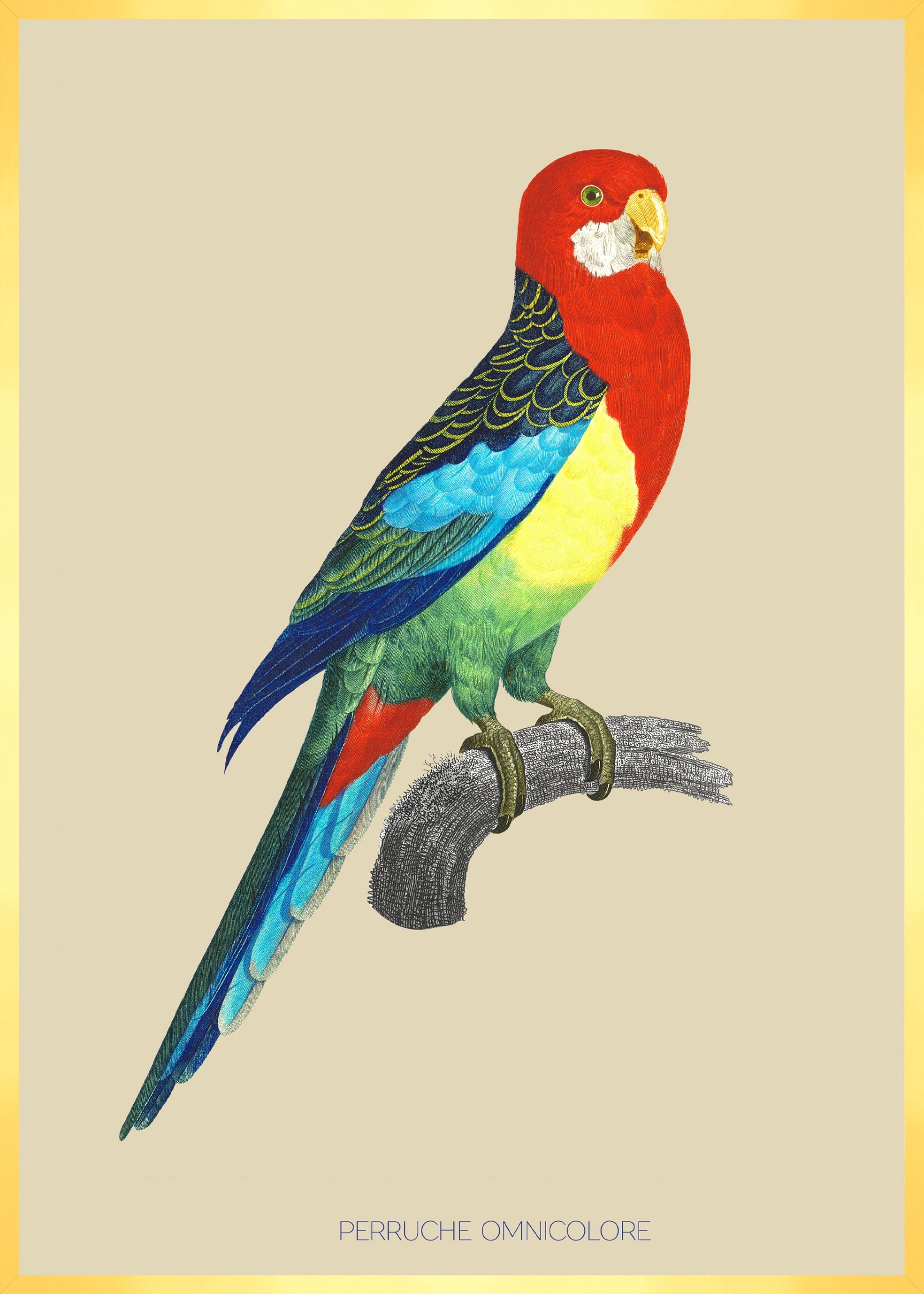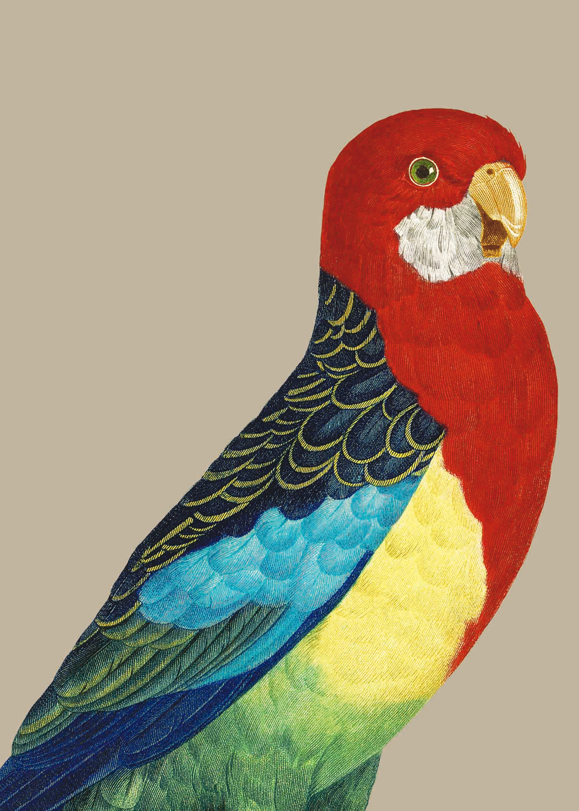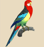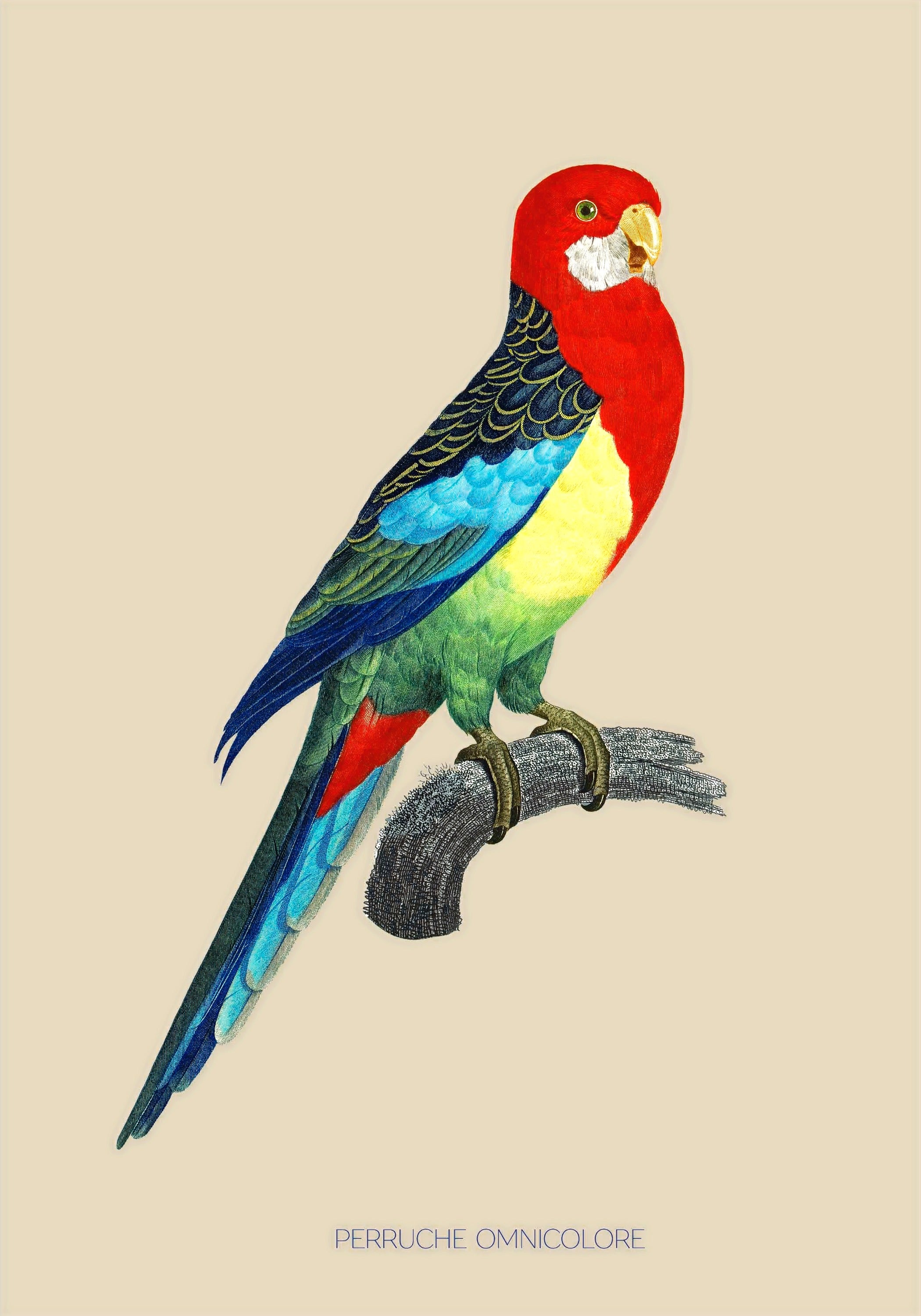 Illustration d'une perruche omnicolore à la gorge rouge flamboyant et aux couleurs de l 'arc-en-ciel.