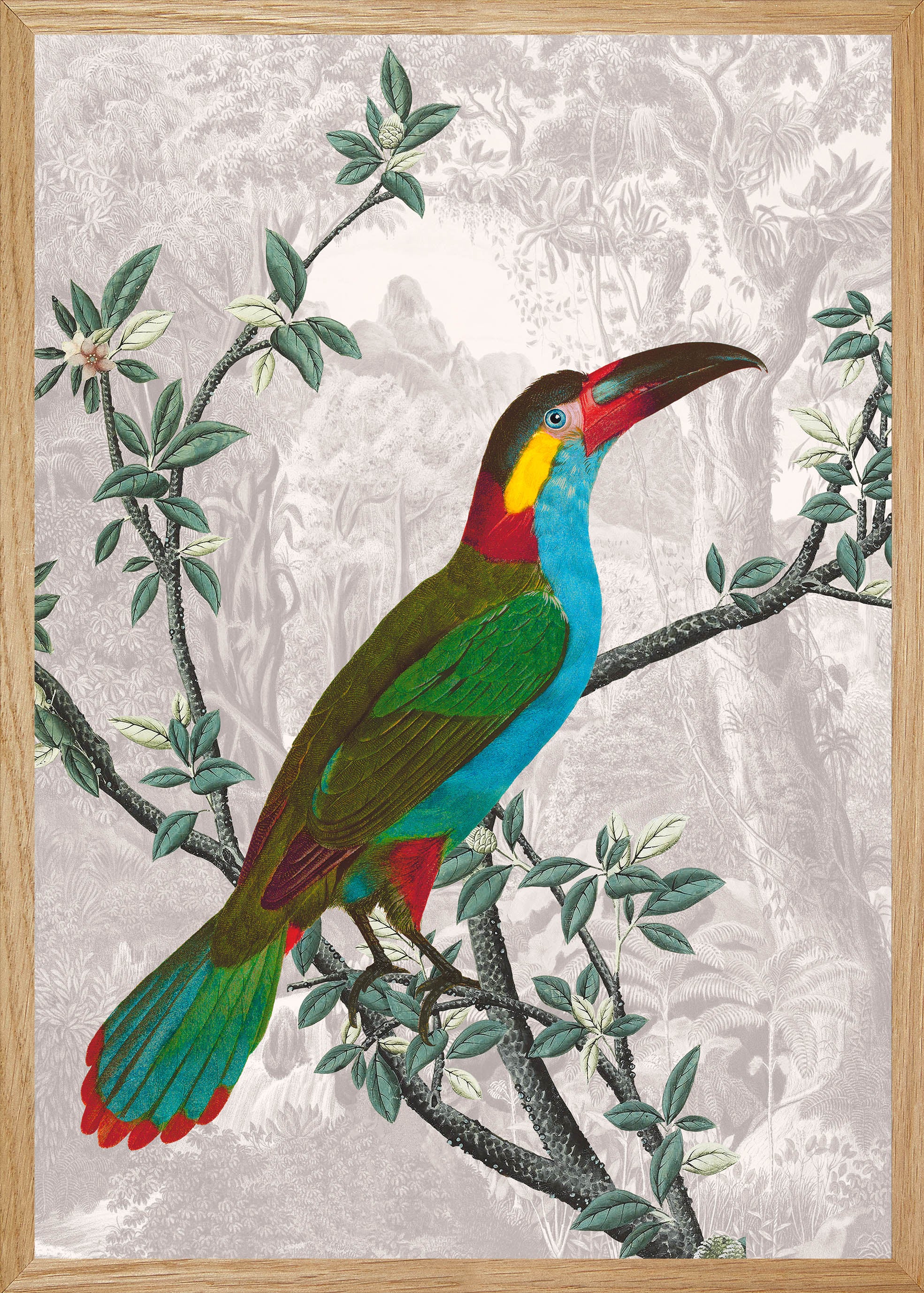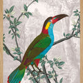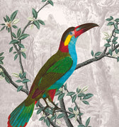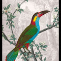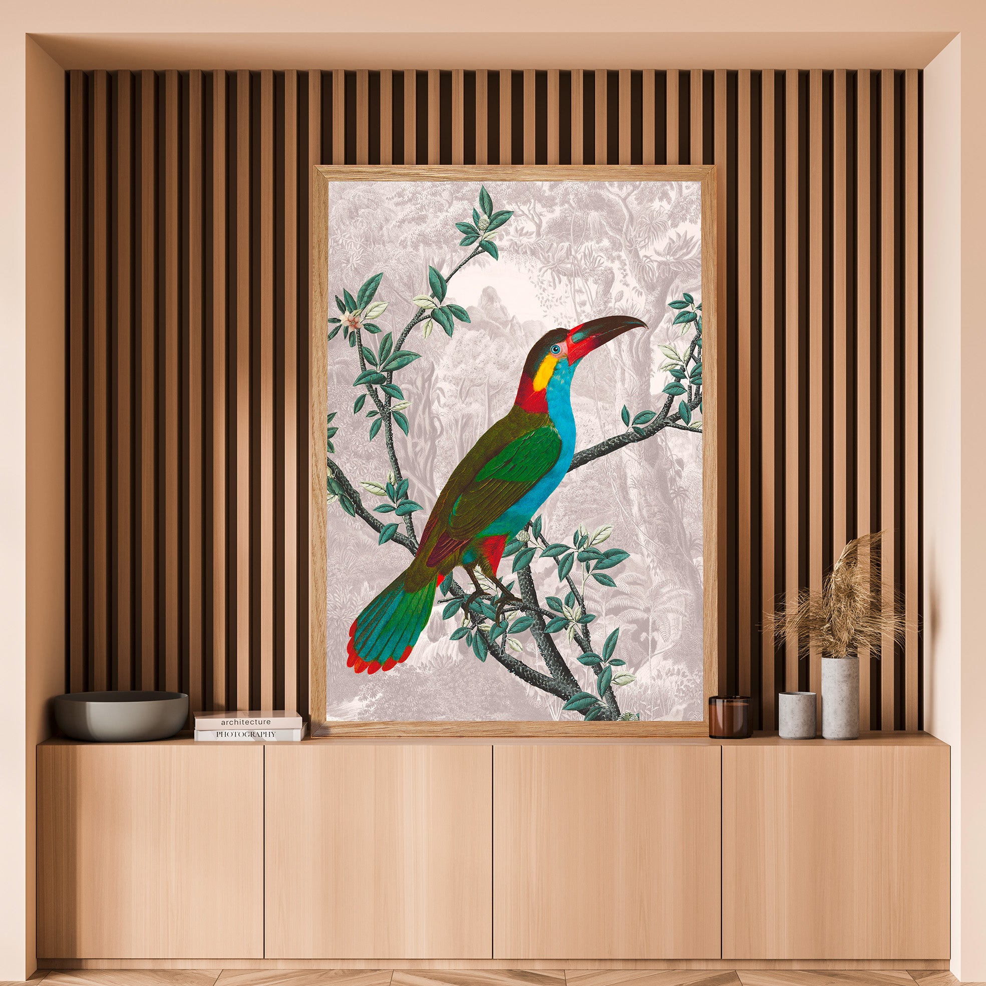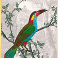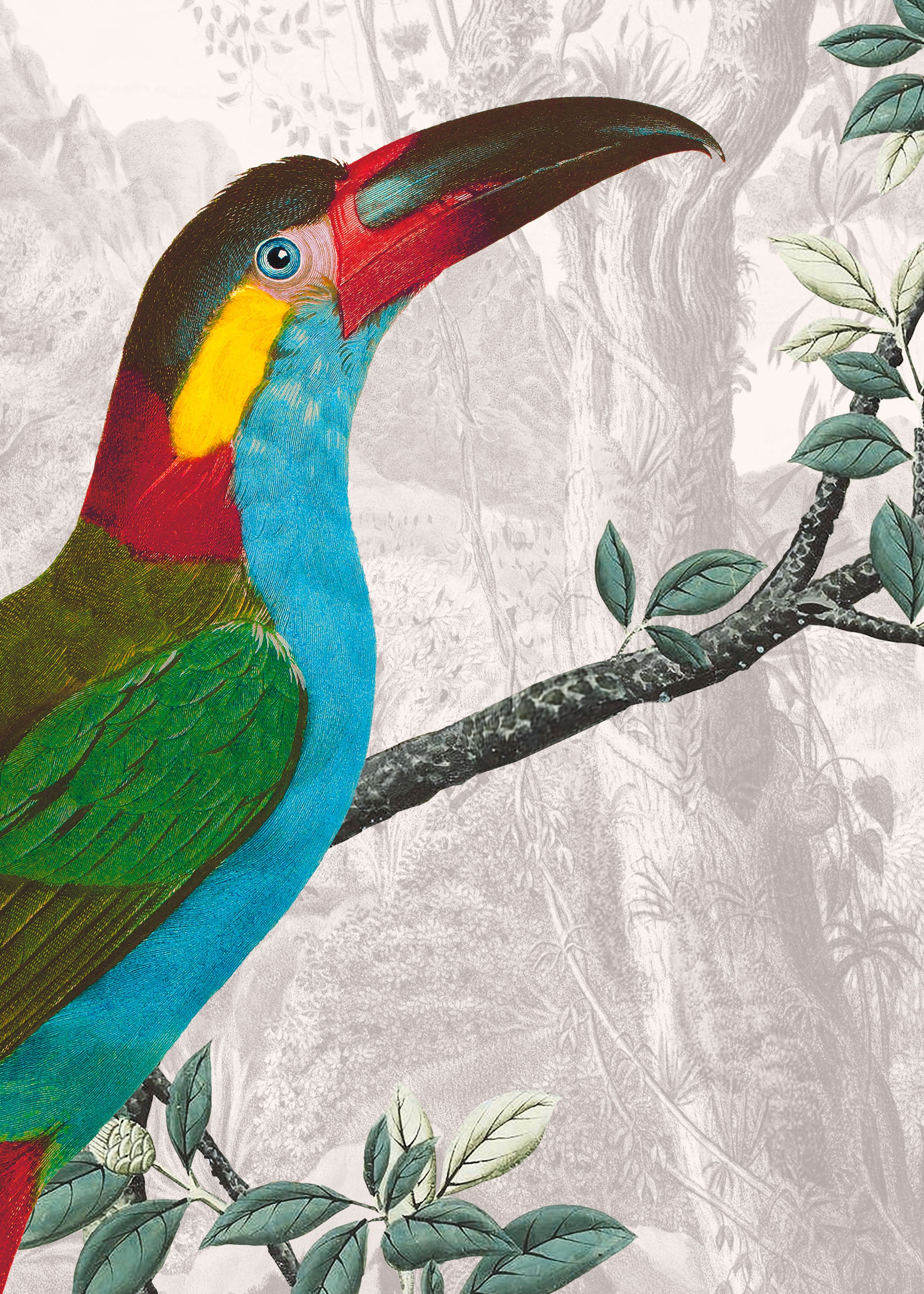 Illustration décorative de ce fascinant toucan au plumage multicolore et à la gorge turquoise habitant la canopée des forêts humides du continent sud-américain .