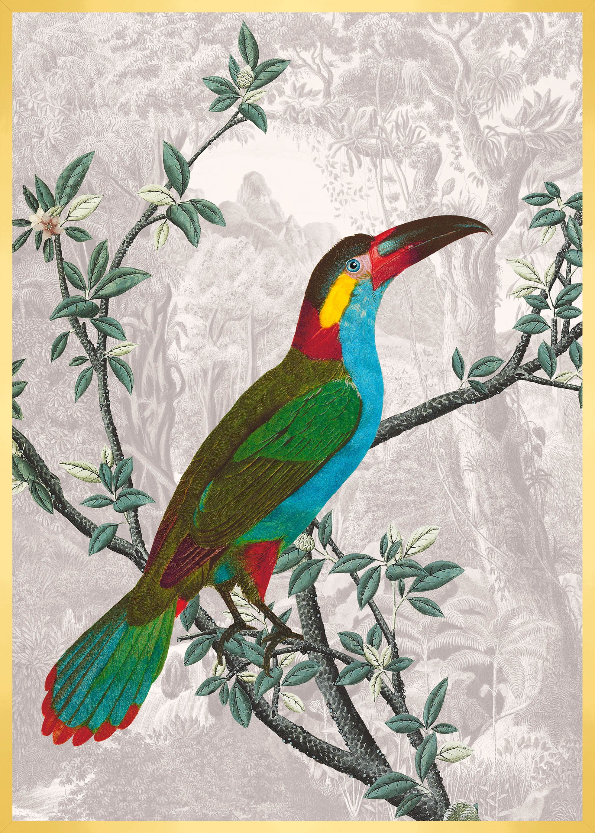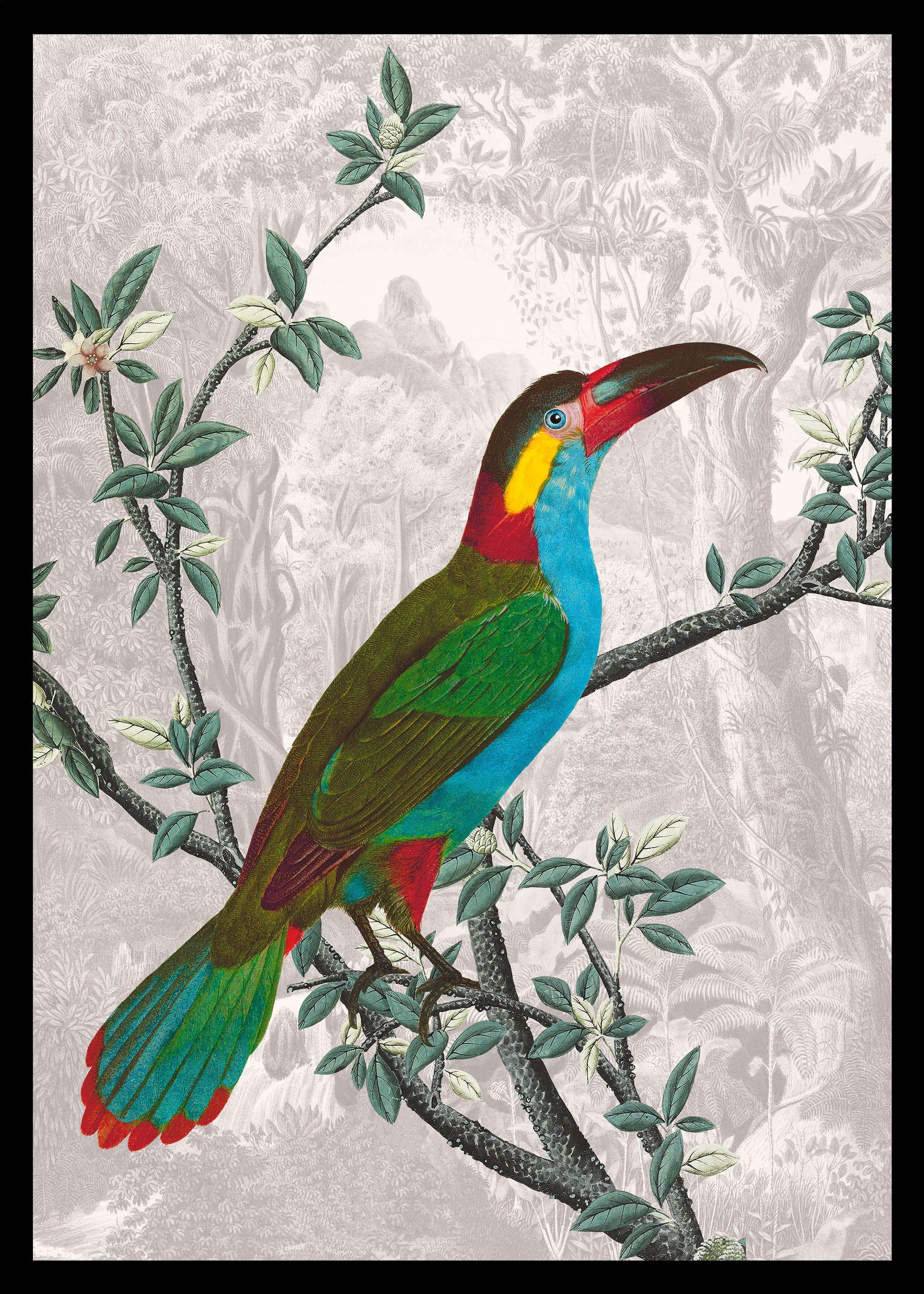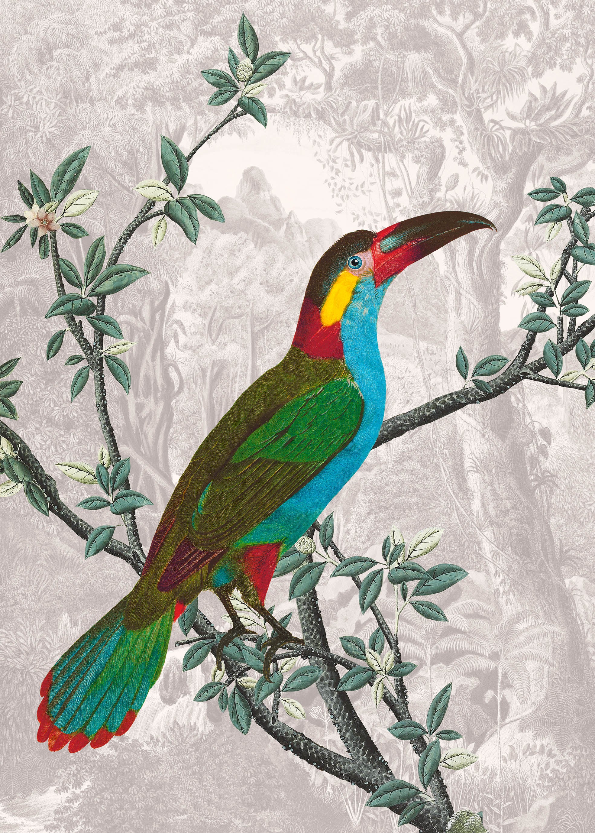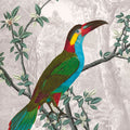 Illustration décorative de ce fascinant toucan au plumage multicolore et à la gorge turquoise habitant la canopée des forêts humides du continent sud-américain .