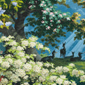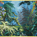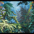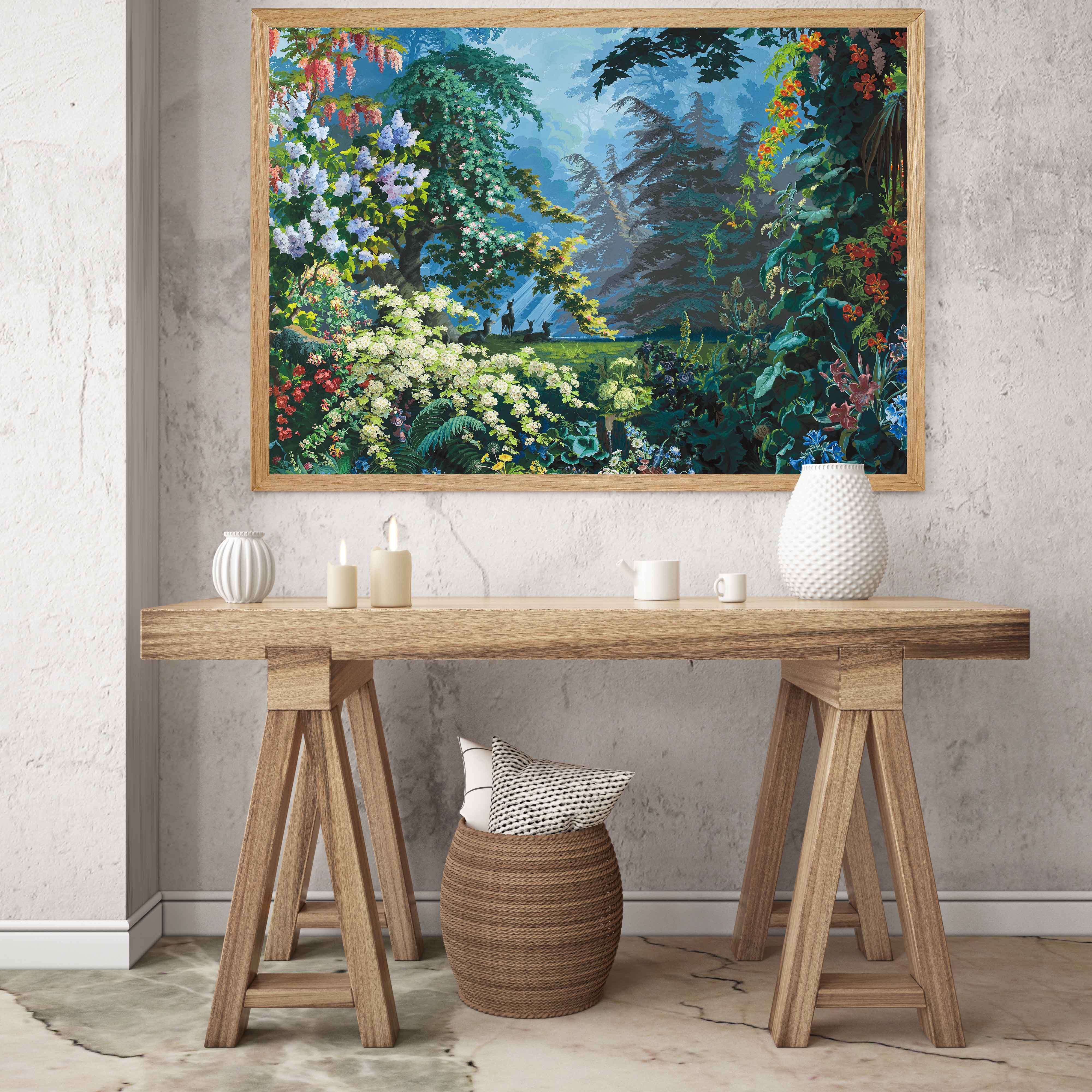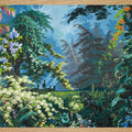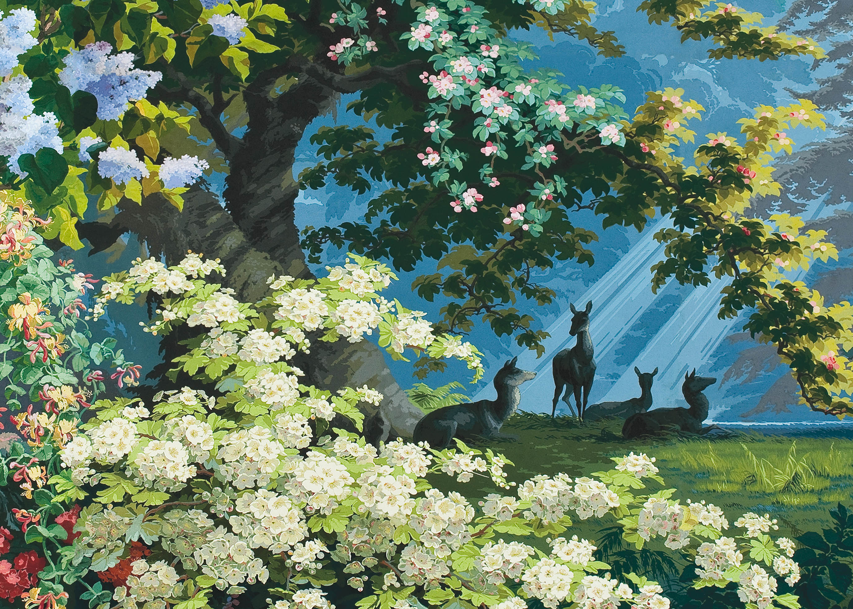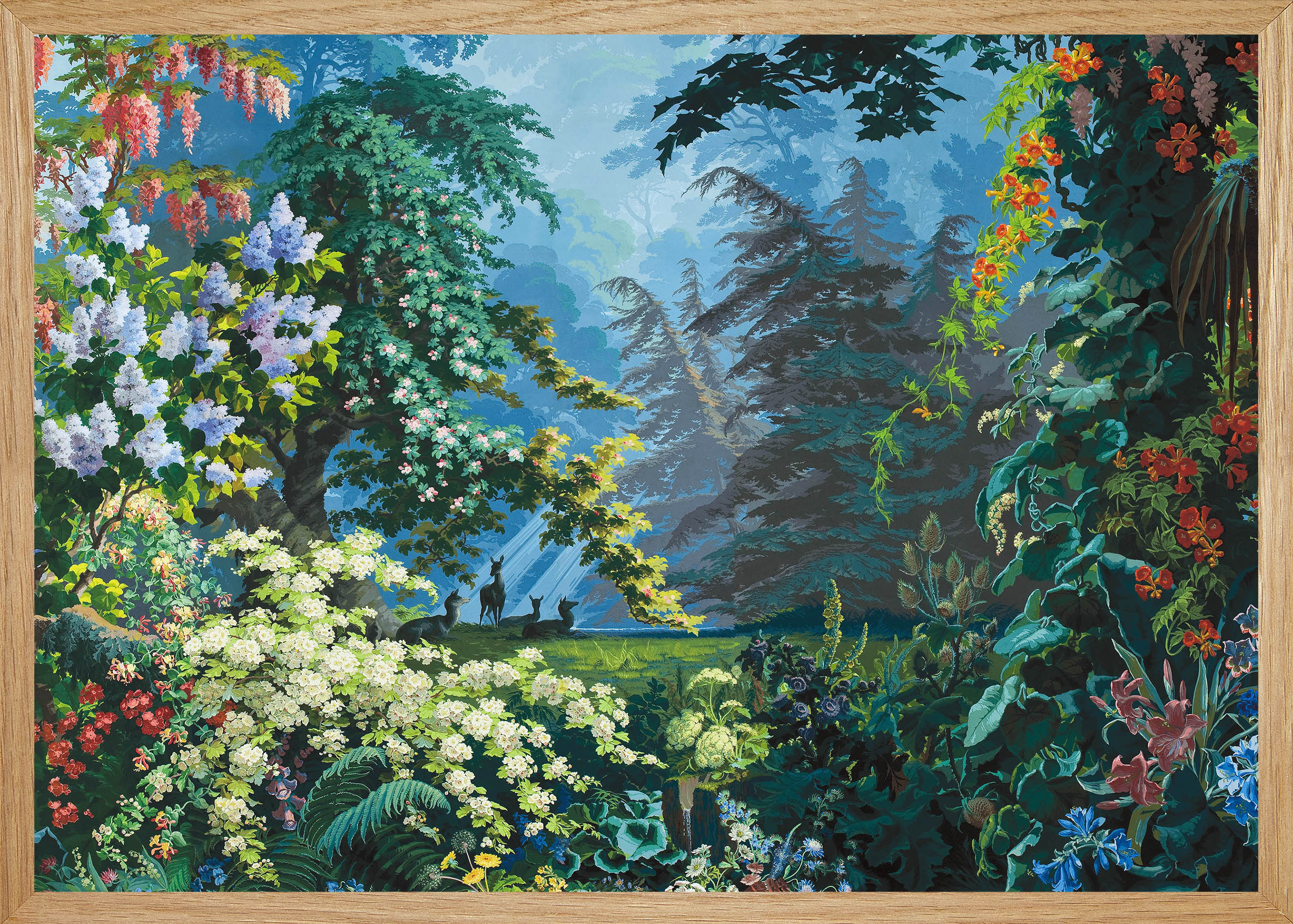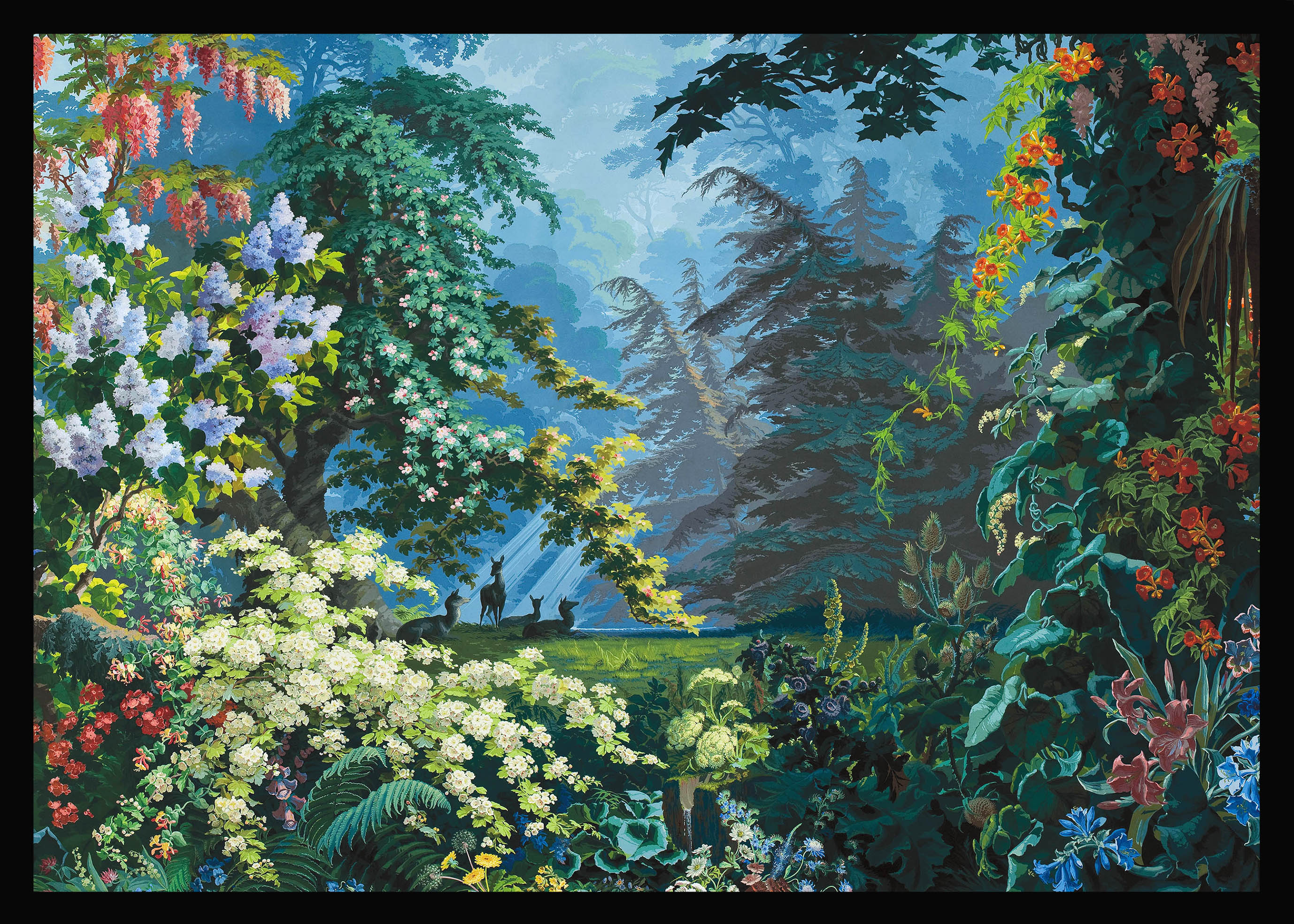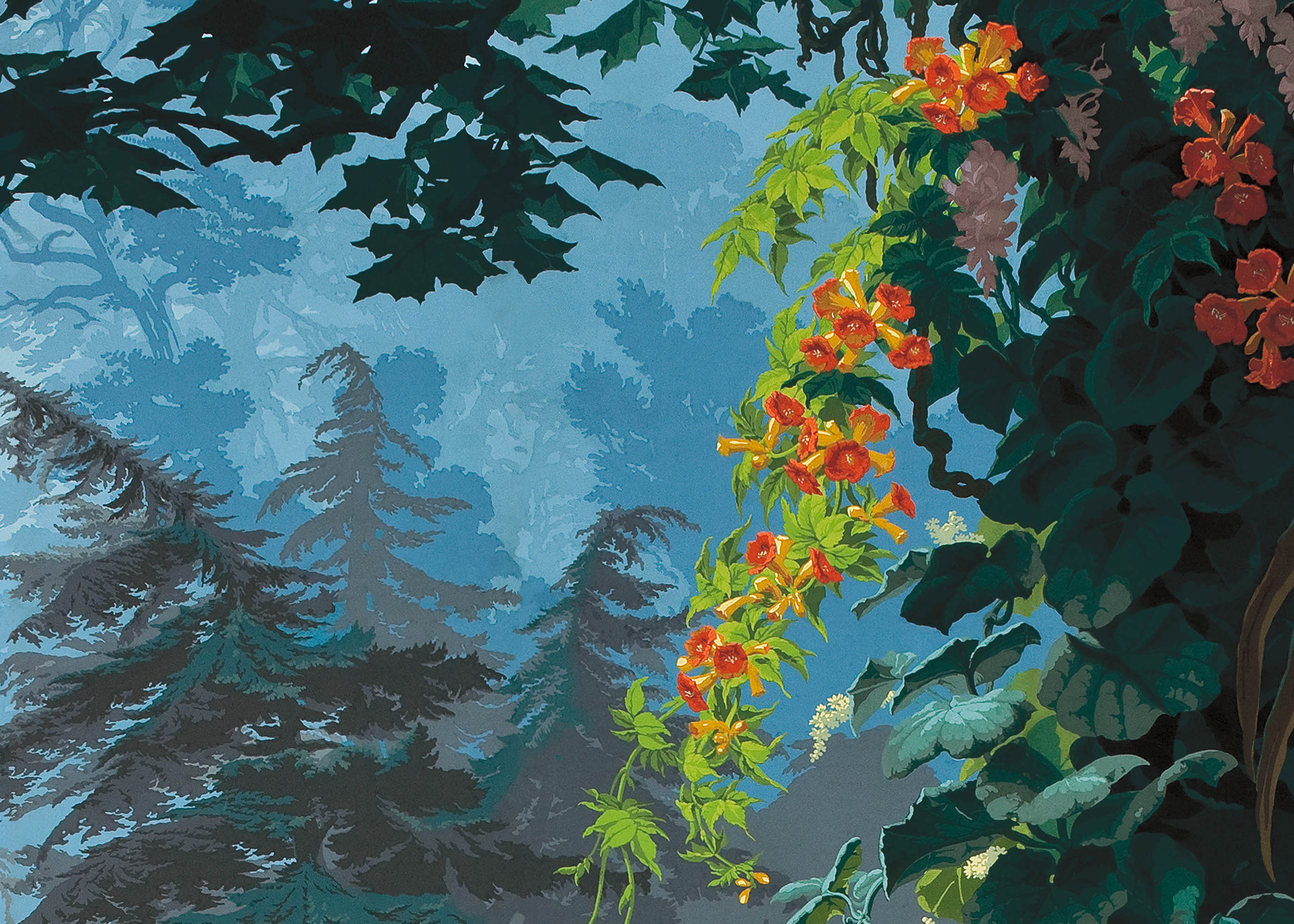 It is a heavenly setting whose fantasized representation of nature, with blue and green shades and lush landscape, dense forests, mountains, cascades of flowers and animals, responds to an idyllic vision of a time when botanical discoveries fueled the imagination. It is a representation of an earthly paradise without seasons or geographical boundaries. Plants like lily of the valley, viper bugloss, Alpine carnation, Caucasian scabiousa, Clivia, Peruvian amaryllis, Amazonian bromeliads, Indian lotus, European water lily and Japanese hydrangea, not to mention oaks, cedars and palm trees coexist in this fantastic Edenic world.