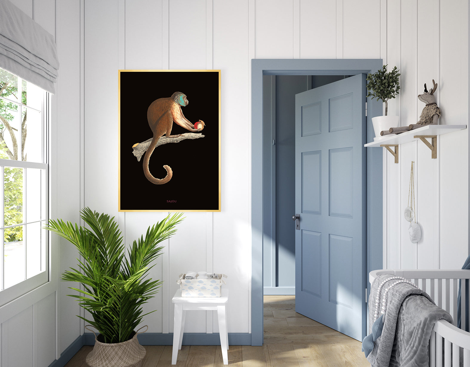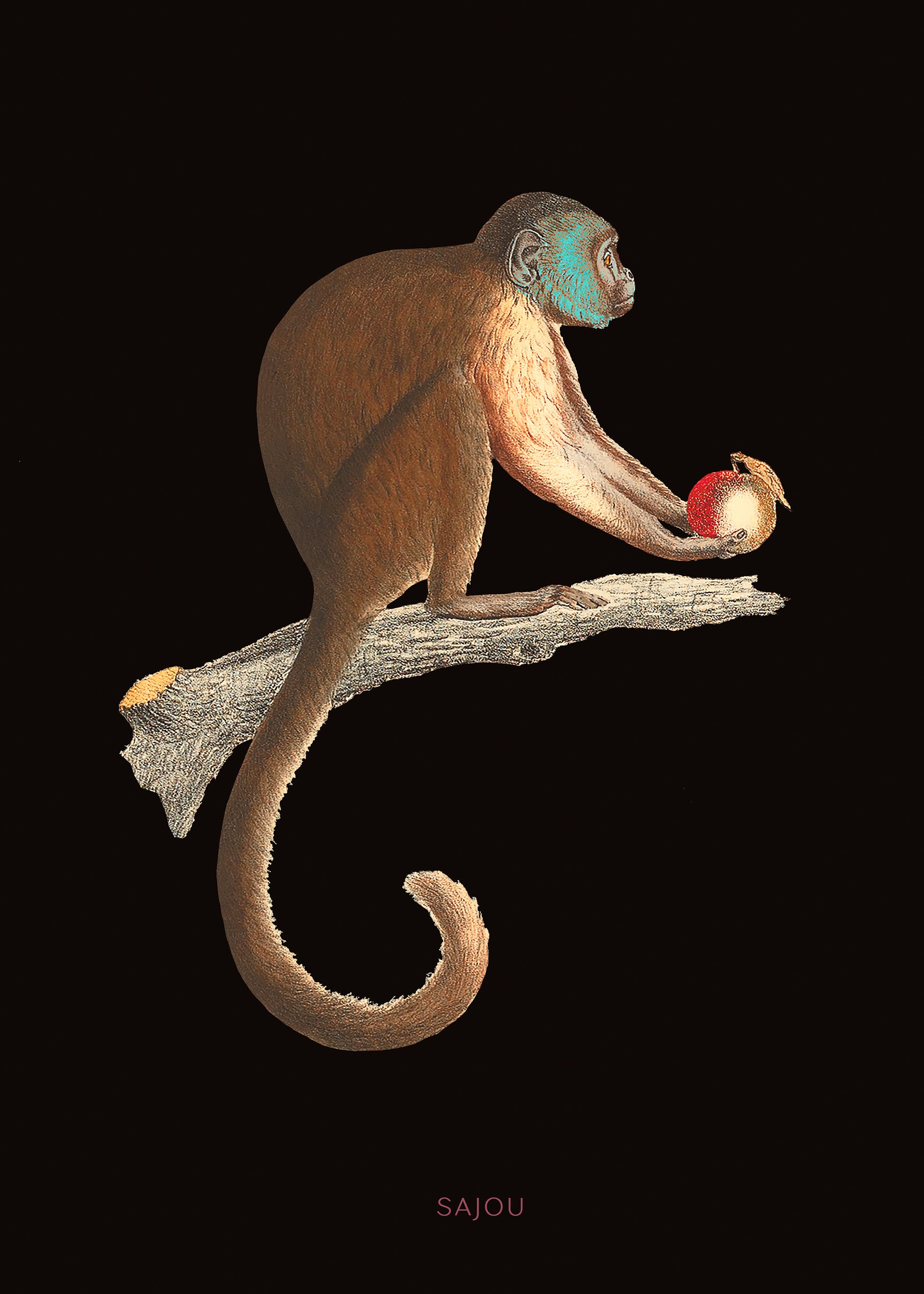 A small monkey from South America , the sajou is captured from life by this illustration inspired by zoological drawings of scientific explorations.