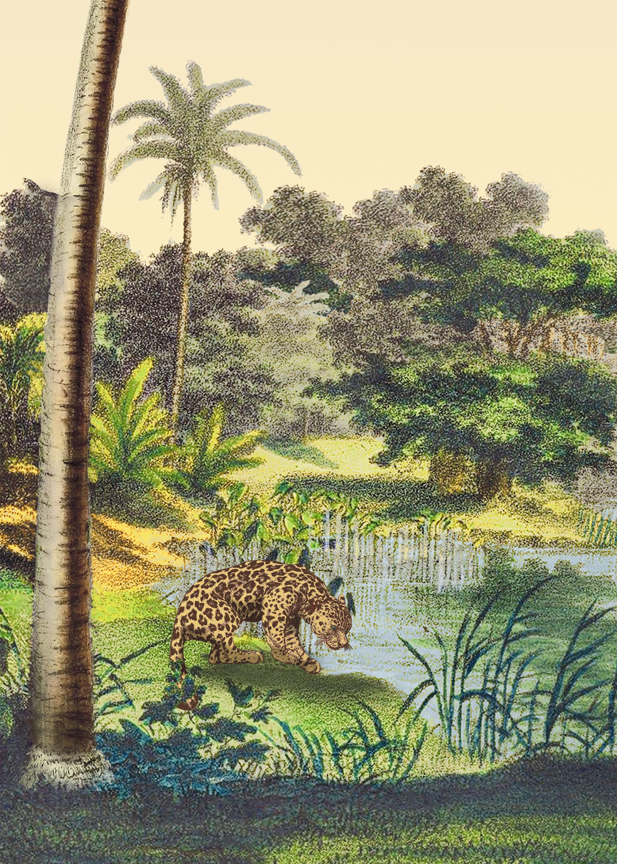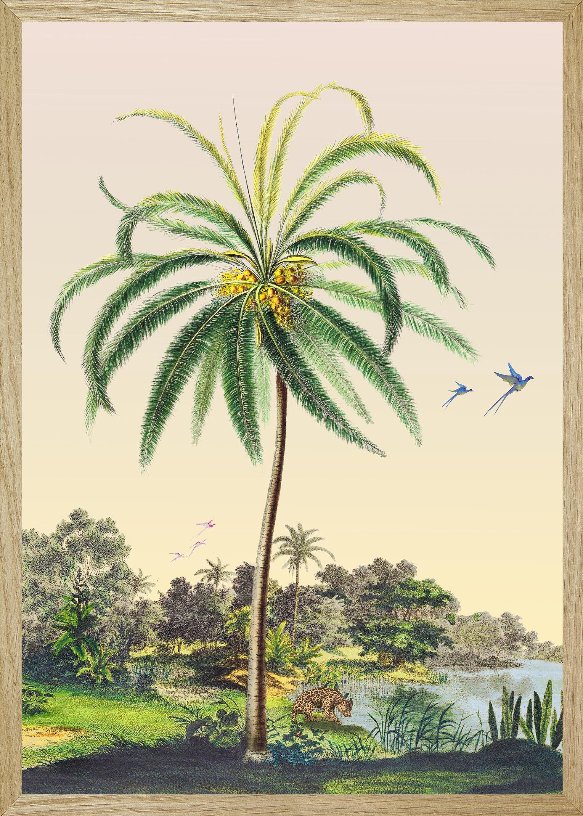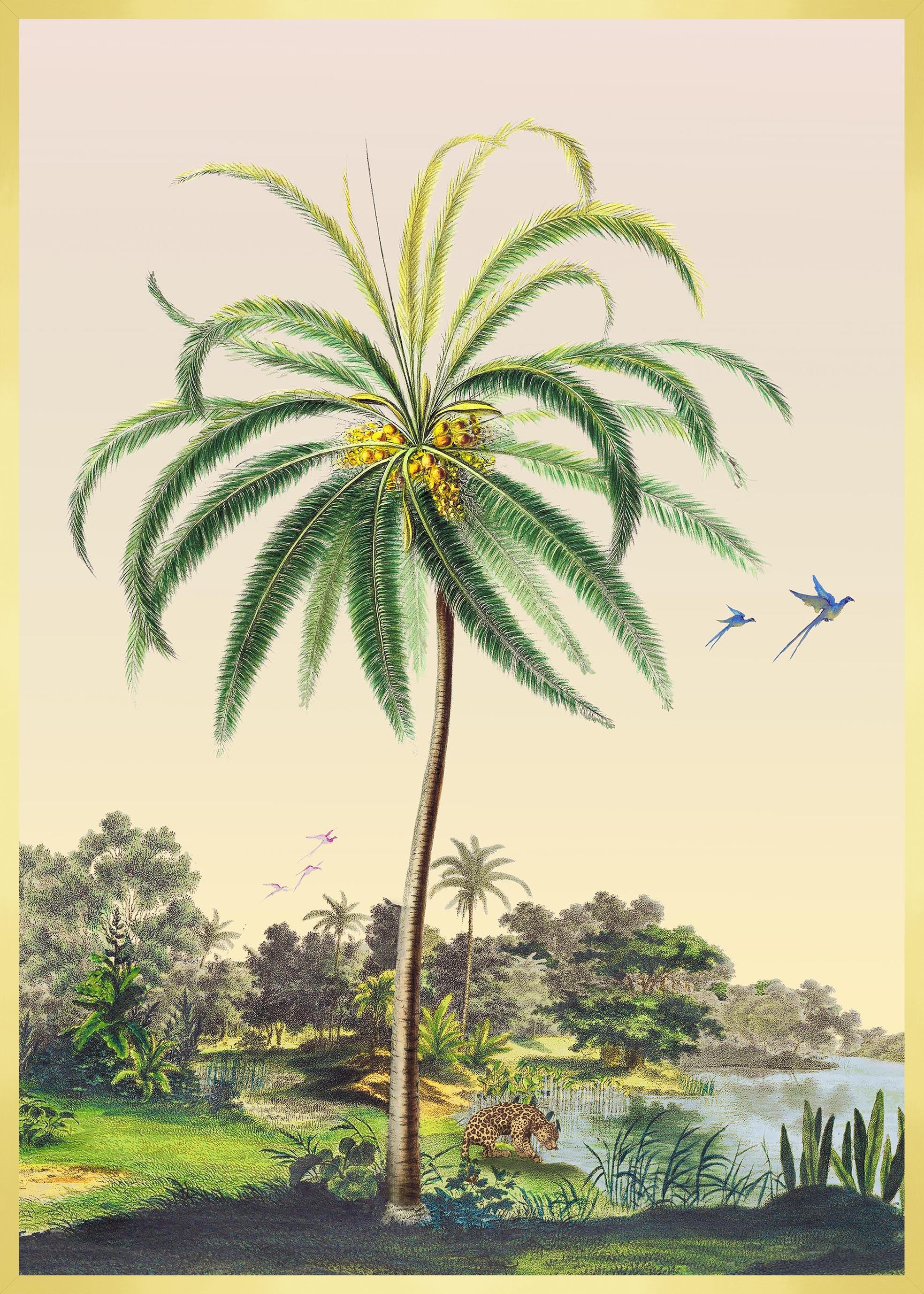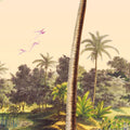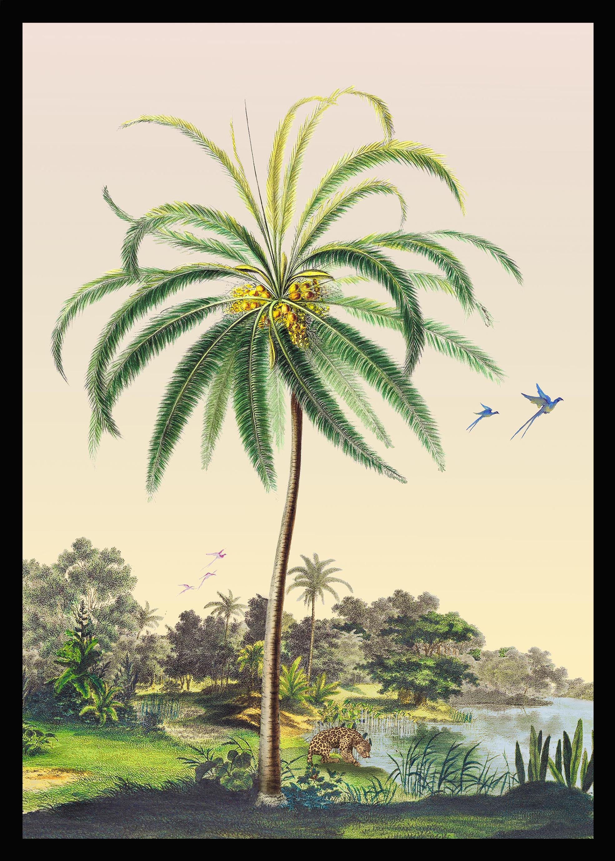 Illustration of a coconut tree with gold-colored fruits, a majestic jaguar, the undisputed king of the tropical forests, a flock of multicolored birds surrounded by a yellow and pale pink sky evoking the softness of the first light of day. An immersive setting for a poetic decoration.