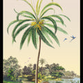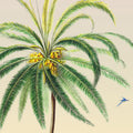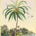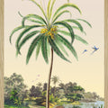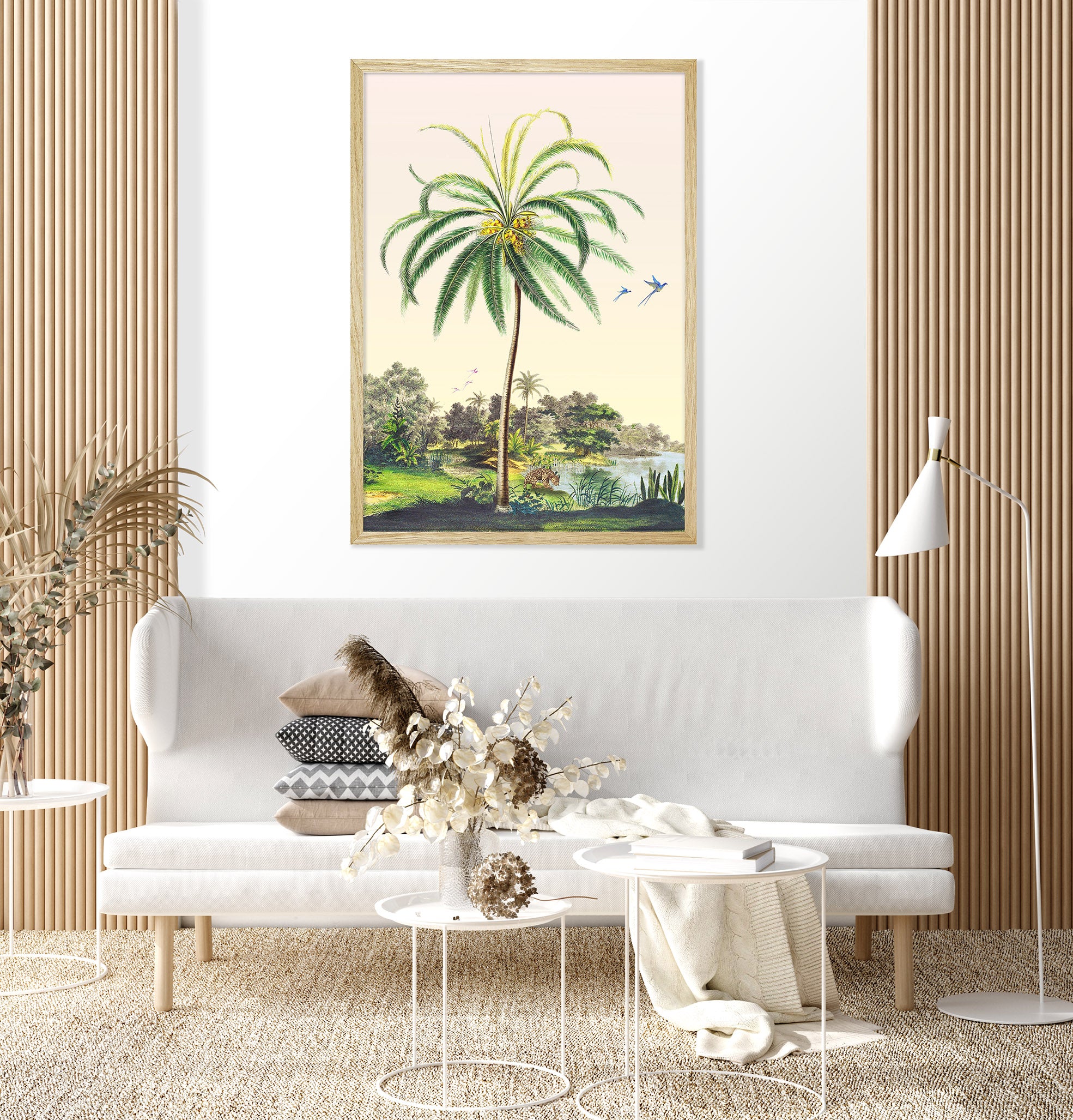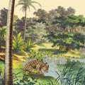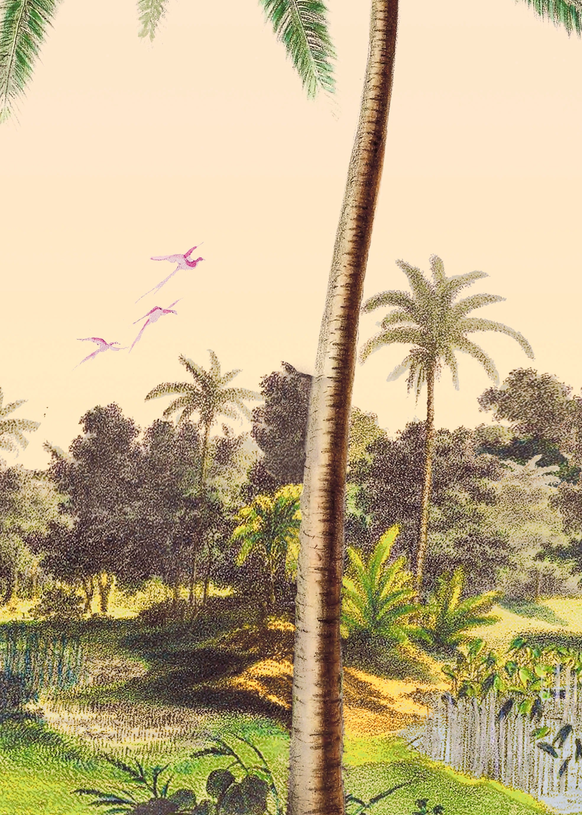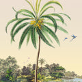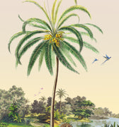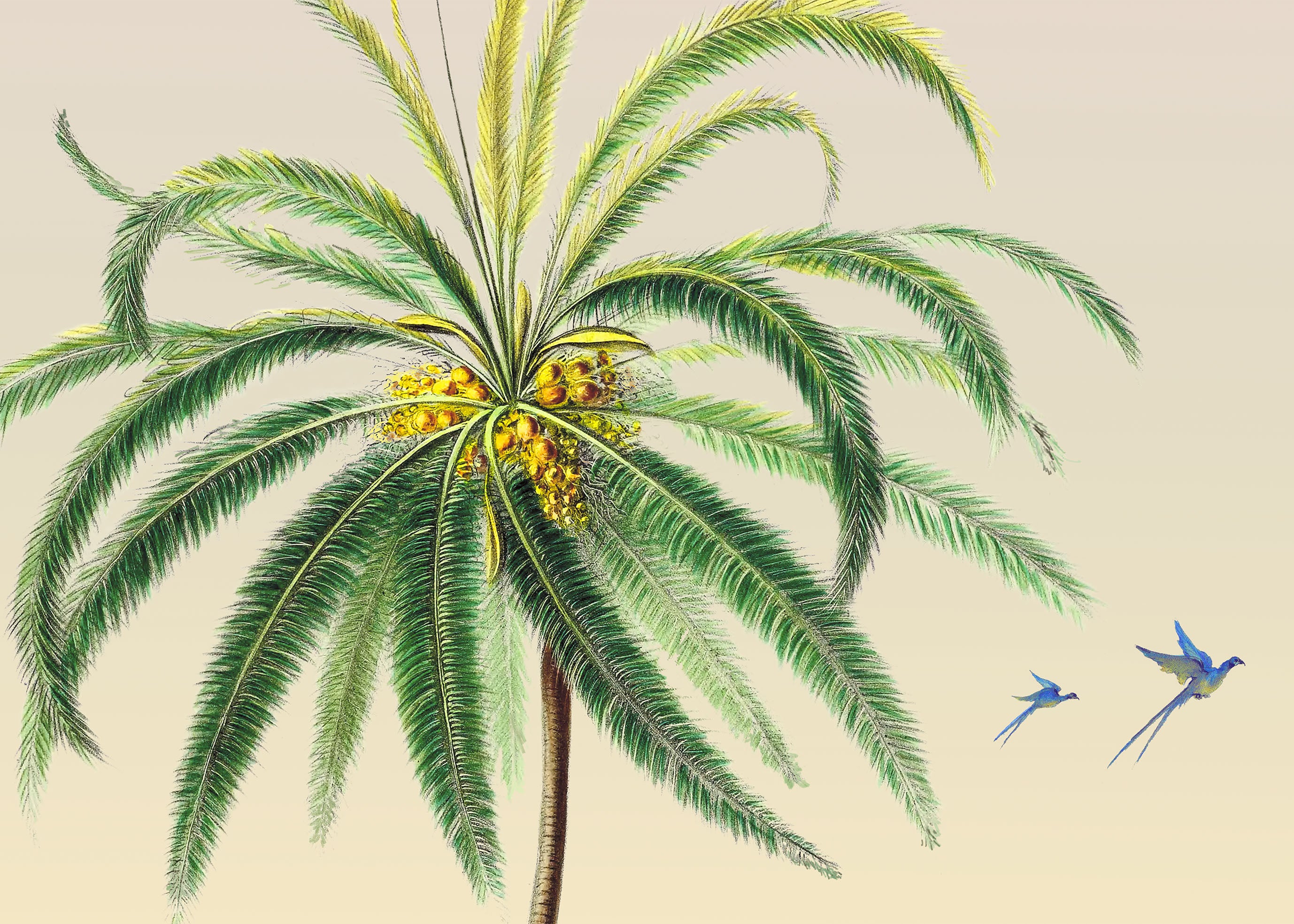 Illustration of a coconut tree with gold-colored fruits, a majestic jaguar, the undisputed king of the tropical forests, a flock of multicolored birds surrounded by a yellow and pale pink sky evoking the softness of the first light of day. An immersive setting for a poetic decoration.