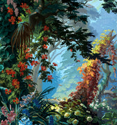 Eden lives up to its name so well. It is a heavenly setting whose fantasized representation of nature, with blue and green shades and lush landscape, dense forests, mountains, cascades of flowers and animals, responds to an idyllic vision of a time when botanical discoveries fueled the imagination. It is a representation of an earthly paradise without seasons or geographical boundaries. Plants like lily of the valley, viper bugloss, Alpine carnation, Caucasian scabiousa, Clivia, Peruvian amaryllis, Amazonian bromeliads, Indian lotus, European water lily and Japanese hydrangea, not to mention oaks, cedars and palm trees coexist in this fantastic Edenic world.