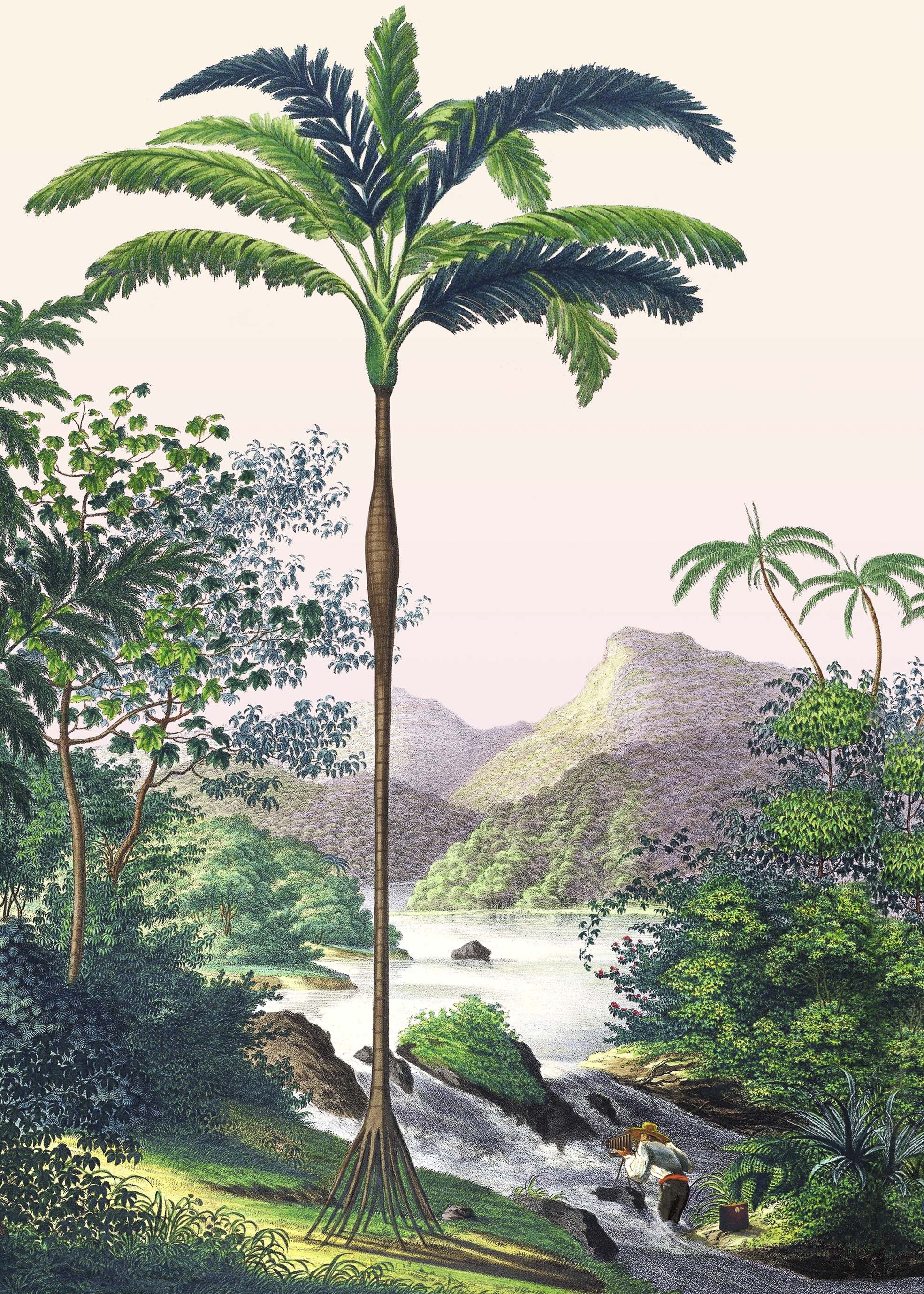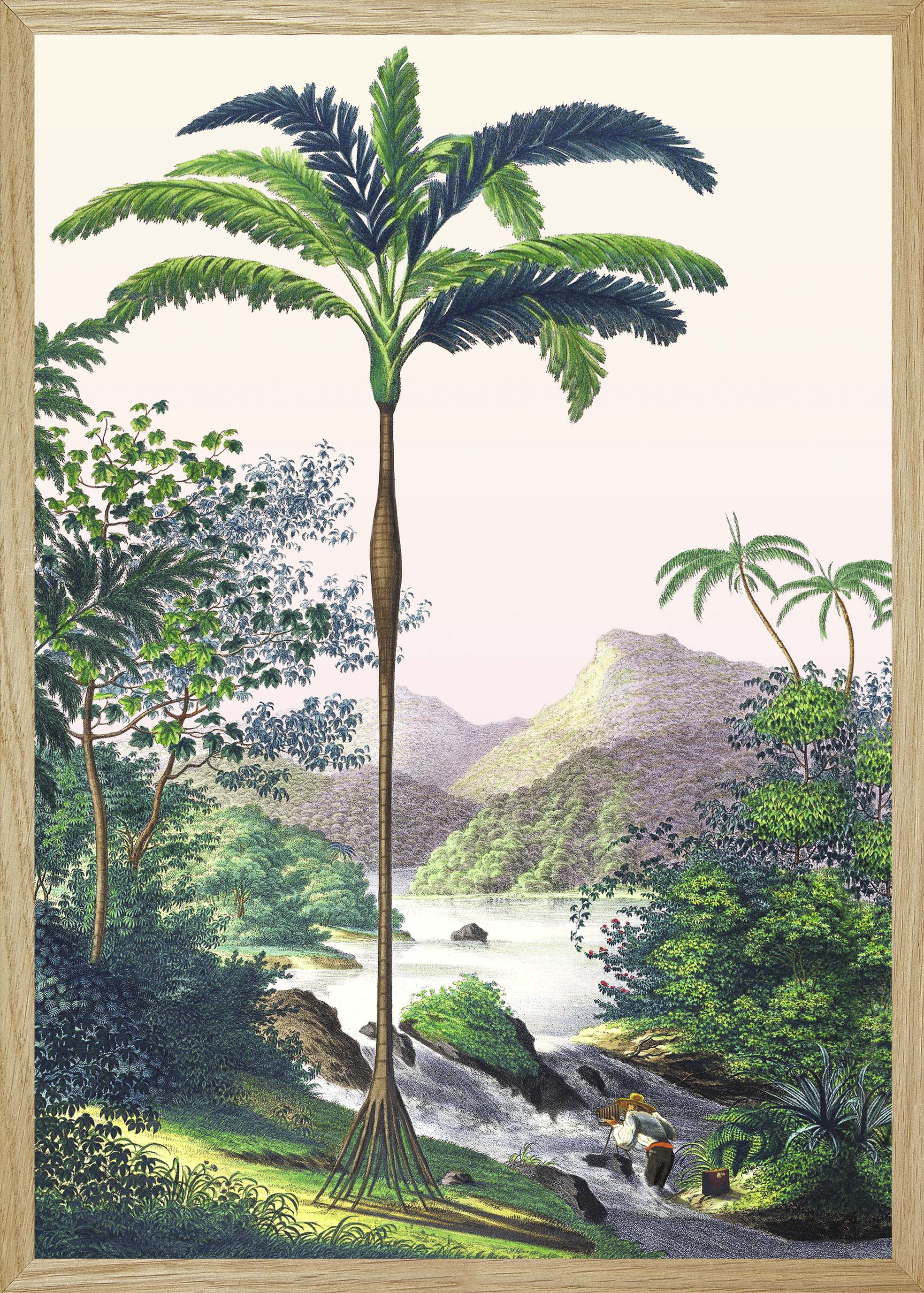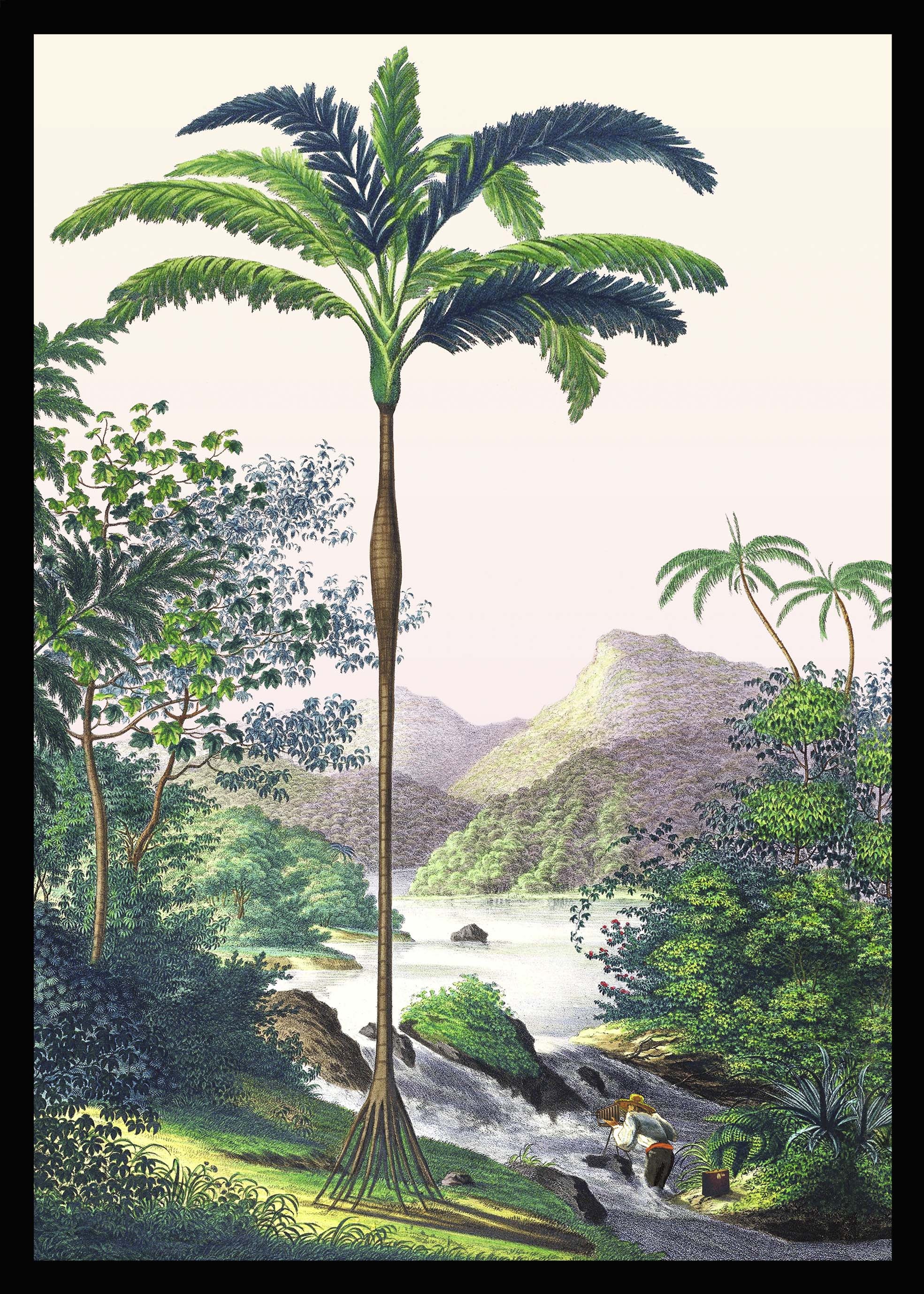 This illustration of a Brazilian landscape located on the edge of the Amazon on the banks of the Rio Japura river and its magnificent waterfalls evokes the stories of exploration of the New World. A naturalist with his camera comes to immortalize this landscape and this morning sky in tones of yellow and pink.