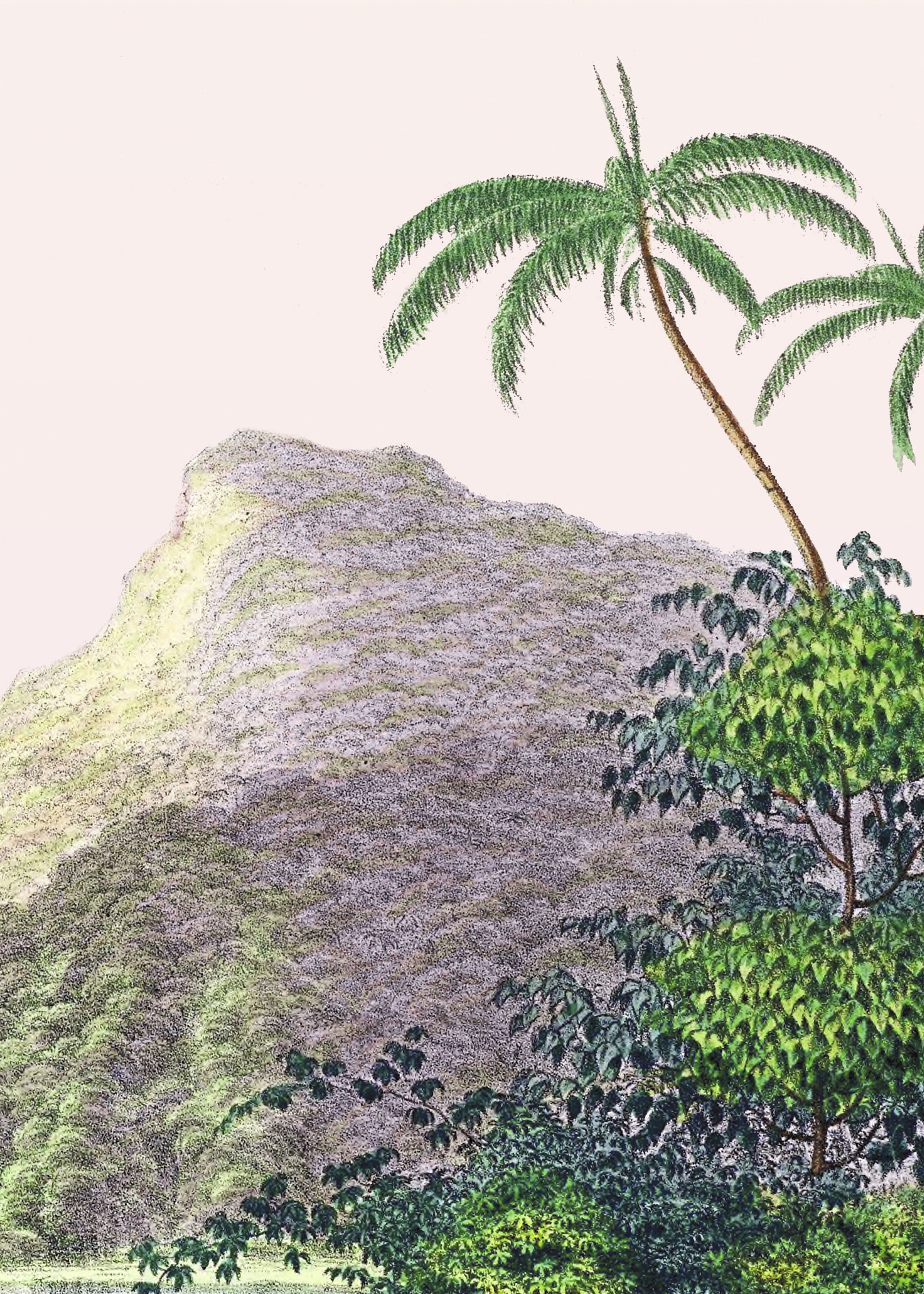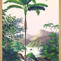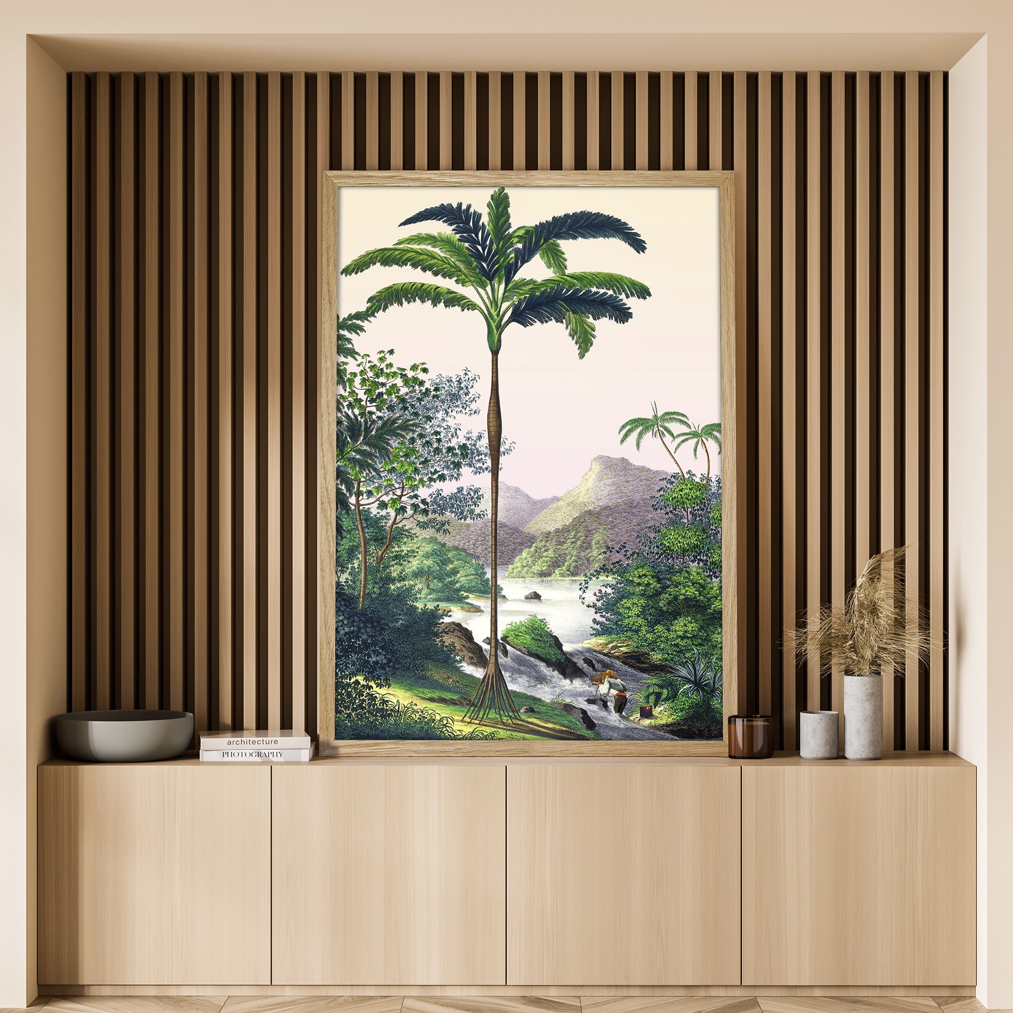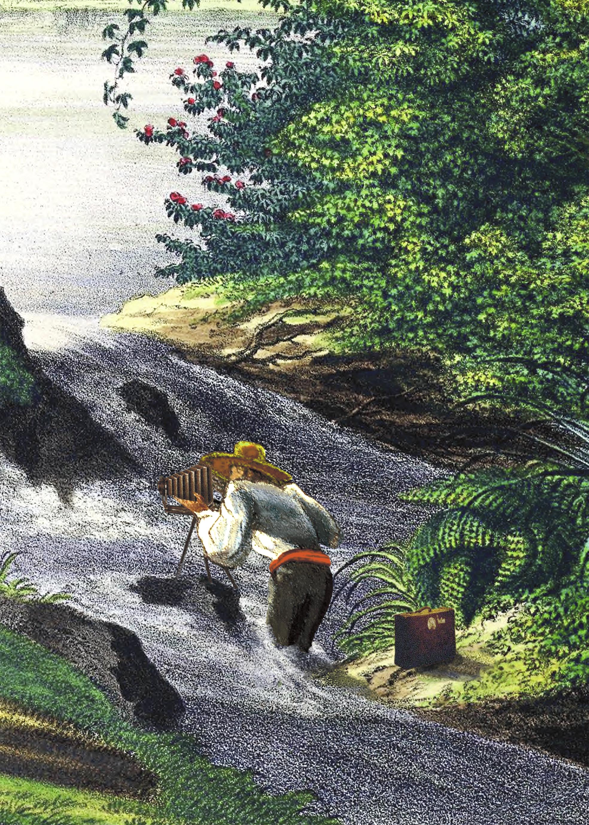 This illustration of a Brazilian landscape located on the edge of the Amazon on the banks of the Rio Japura river and its magnificent waterfalls evokes the stories of exploration of the New World. A naturalist with his camera comes to immortalize this landscape and this morning sky in tones of yellow and pink.