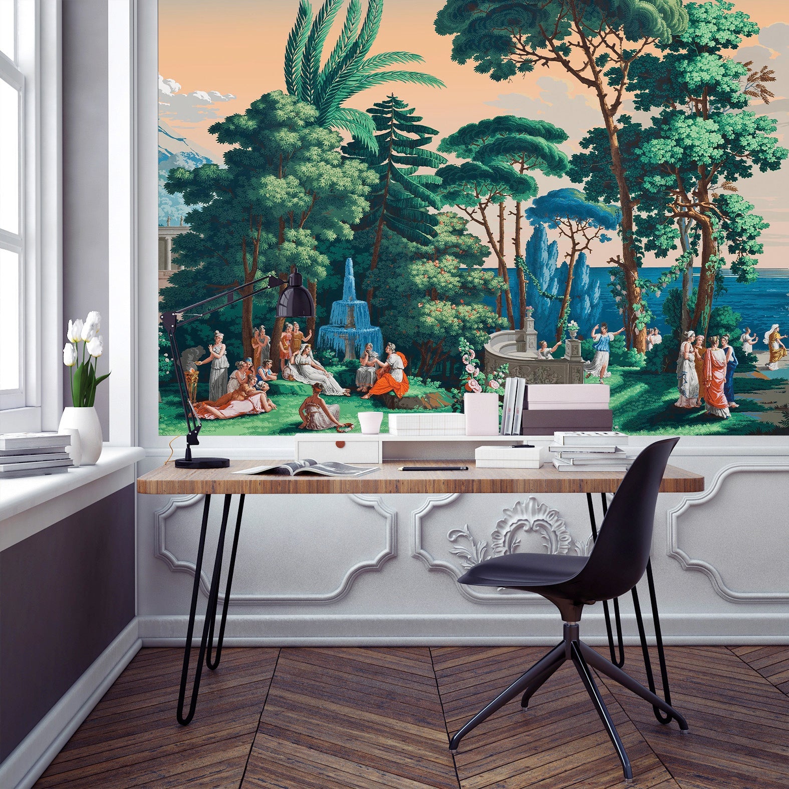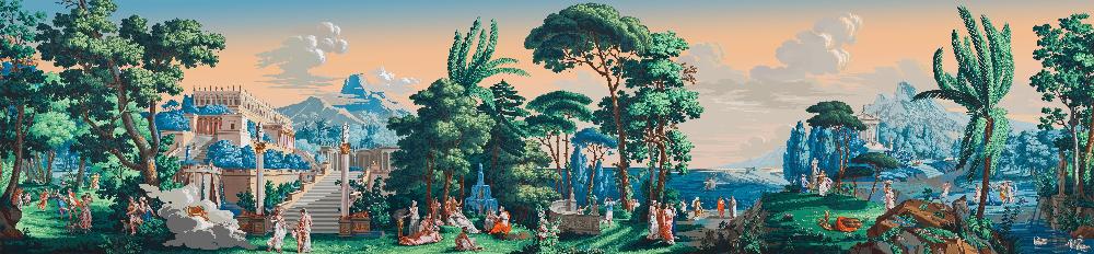The panoramic Landscape of Télémaque, inspired by the eponymous novel by Fénélon, was published in 1818 by the Dufour factory based on a drawing by Xavier Mader. The original decoration made up of 24 strips required the creation of 2027 plates engraved in relief. The paper used was made from old rags. From 1864, this panoramic will be re-edited by the Manufacture Desfossés et Karth. Landscape paintings", panoramic wallpapers, of which Joseph Dufour was one of the most prestigious creators, were a form of wall decoration, specifically French, in keeping with the taste of the 19th century, for the outdoors and the picturesque. Changing the From inside to outside, the panoramic launches the imagination through landscapes, mythological stories, travel reports, successful novels...