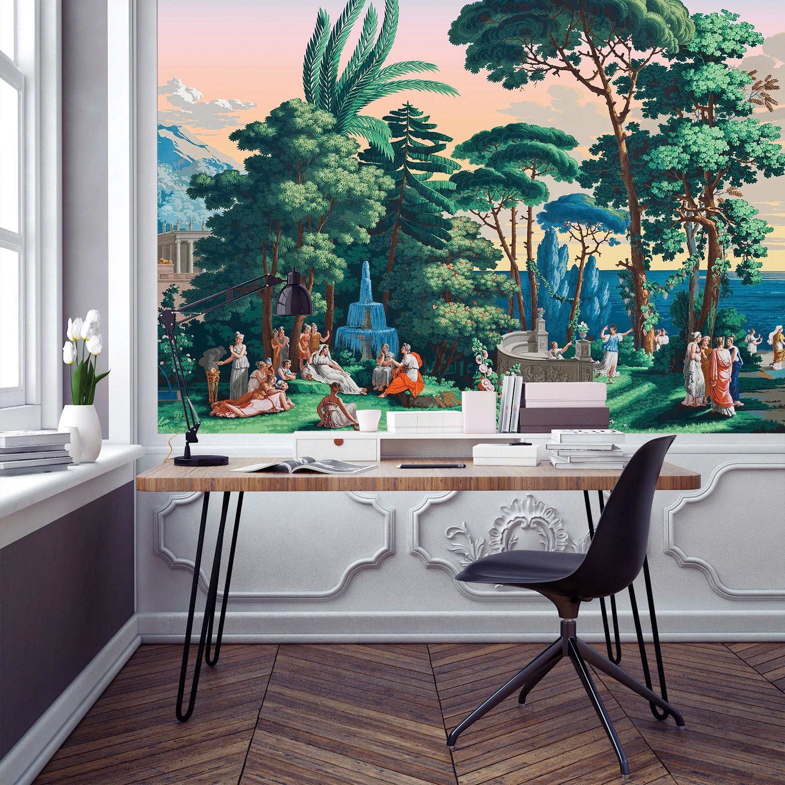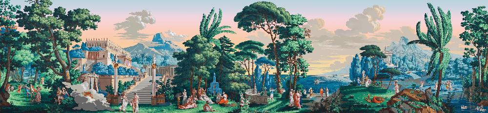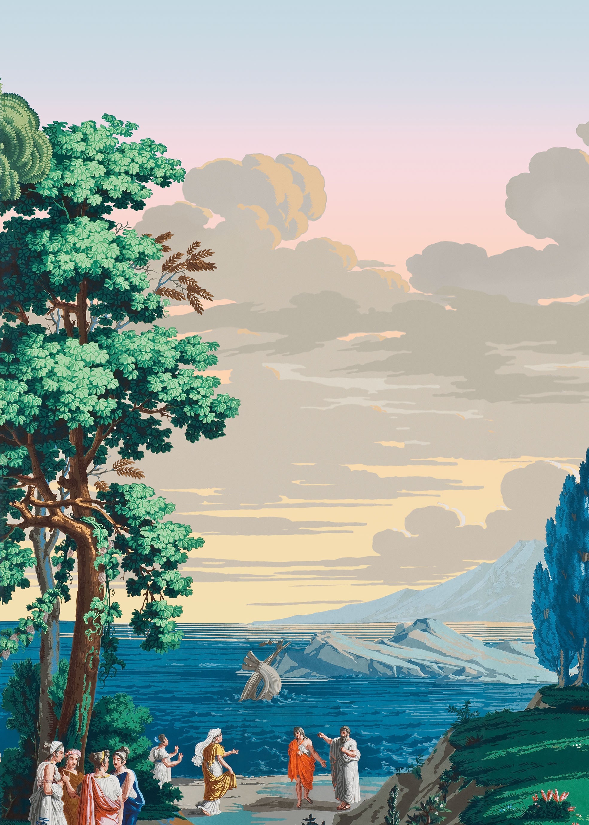 The panoramic Landscape of Télémaque, inspired by the eponymous novel by Fénélon, was published in 1818 by the Dufour factory based on a drawing by Xavier Mader. The original decoration made up of 24 strips required the creation of 2027 plates engraved in relief. The paper used was made from old rags. From 1864, this panoramic will be re-edited by the Manufacture Desfossés et Karth. Landscape paintings", panoramic wallpapers, of which Joseph Dufour was one of the most prestigious creators, were a form of wall decoration, specifically French, in keeping with the taste of the 19th century, for the outdoors and the picturesque. Changing the From inside to outside, the panoramic launches the imagination through landscapes, mythological stories, travel reports, successful novels...