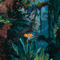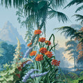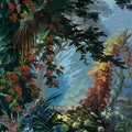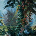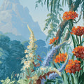 It is a heavenly setting whose fantasized representation of nature, with blue and green shades and lush landscape, dense forests, mountains, cascades of flowers and animals, responds to an idyllic vision of a time when botanical discoveries fueled the imagination. It is a representation of an earthly paradise without seasons or geographical boundaries. Plants like lily of the valley, viper bugloss, Alpine carnation, Caucasian scabiousa, Clivia, Peruvian amaryllis, Amazonian bromeliads, Indian lotus, European water lily and Japanese hydrangea, not to mention oaks, cedars and palm trees coexist in this fantastic Edenic world.
