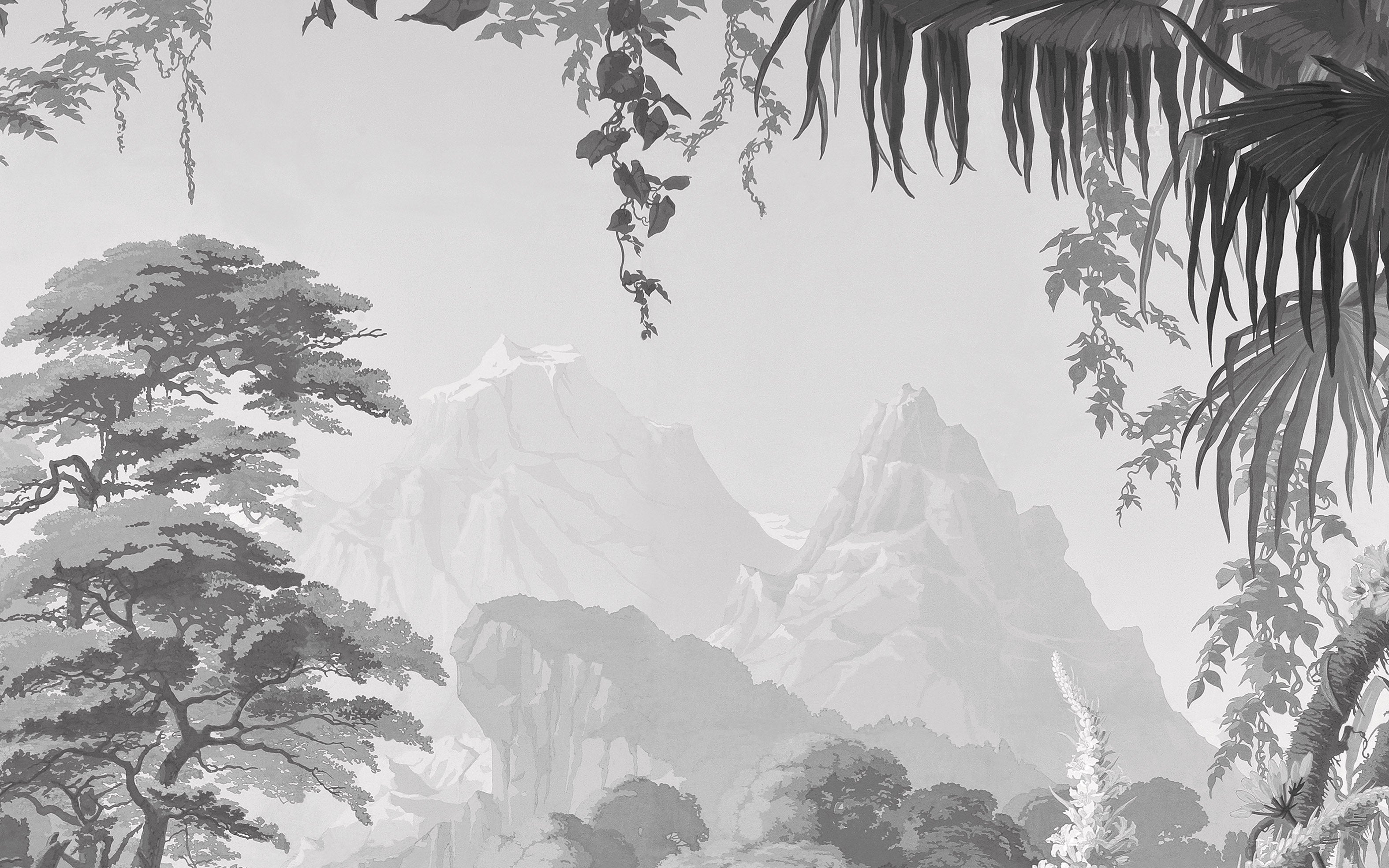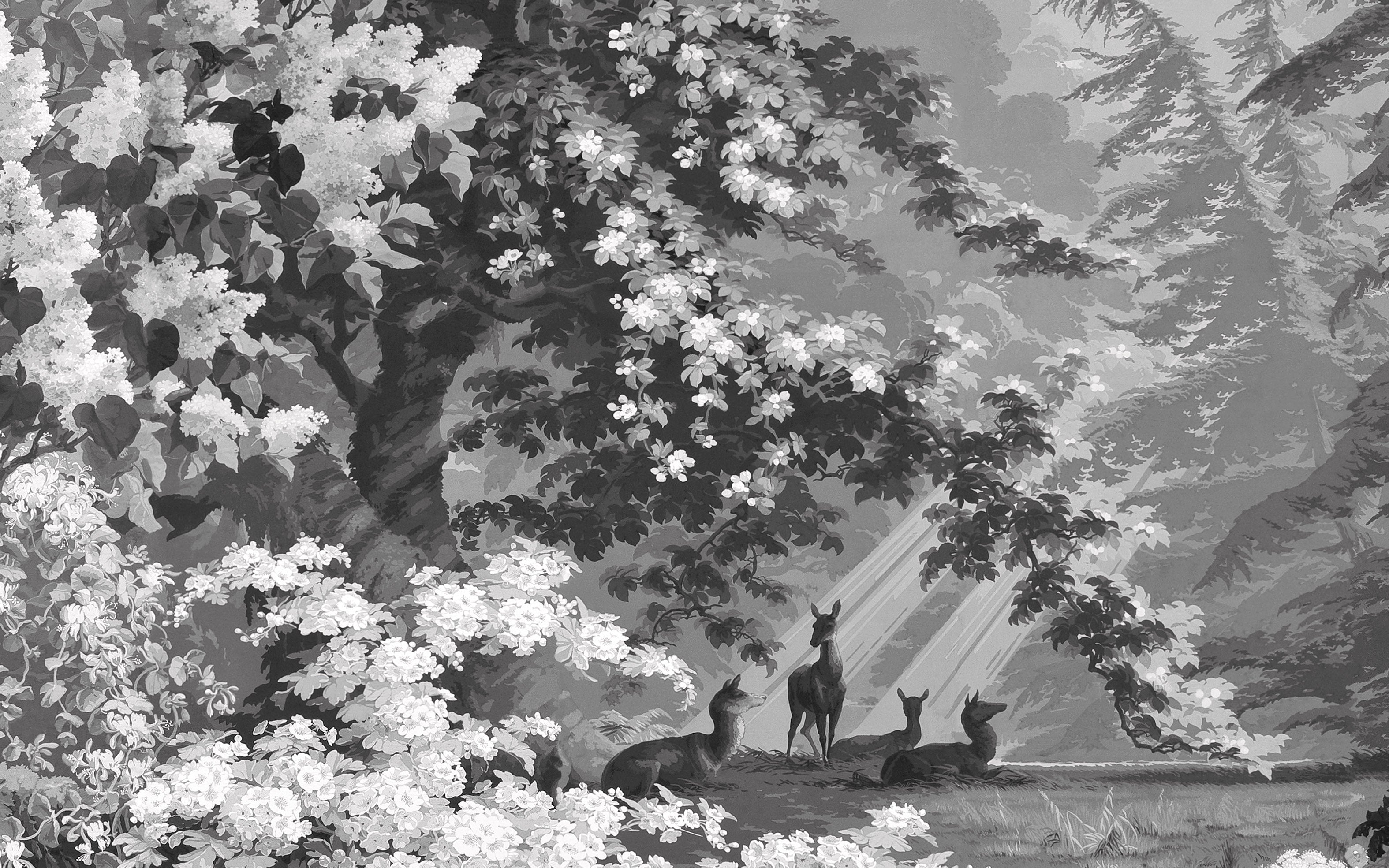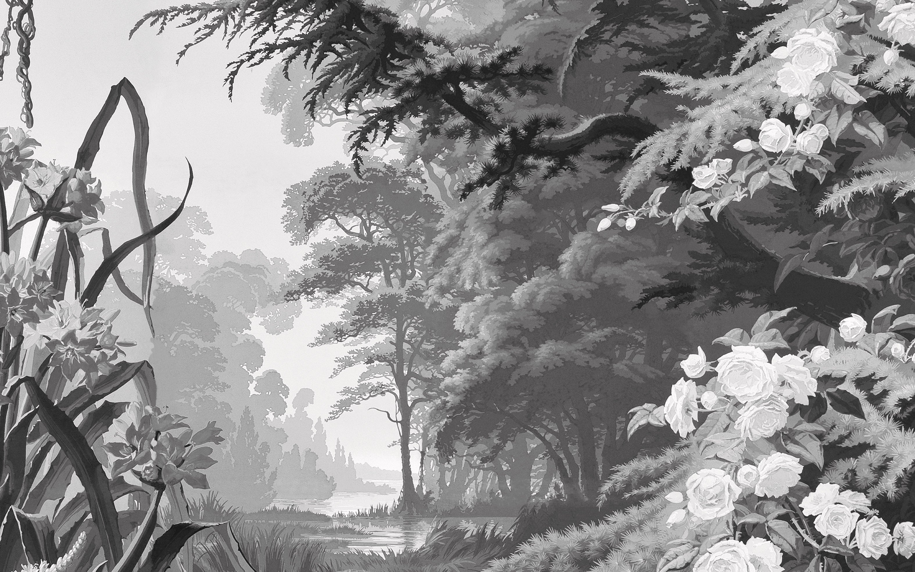 It is a heavenly setting whose fantasized representation of nature, with blue and green shades and lush landscape, dense forests, mountains, cascades of flowers and animals, responds to an idyllic vision of a time when botanical discoveries fueled the imagination. It is a representation of an earthly paradise without seasons or geographical boundaries. Plants like lily of the valley, viper bugloss, Alpine carnation, Caucasian scabiousa, Clivia, Peruvian amaryllis, Amazonian bromeliads, Indian lotus, European water lily and Japanese hydrangea, not to mention oaks, cedars and palm trees coexist in this fantastic Edenic world.