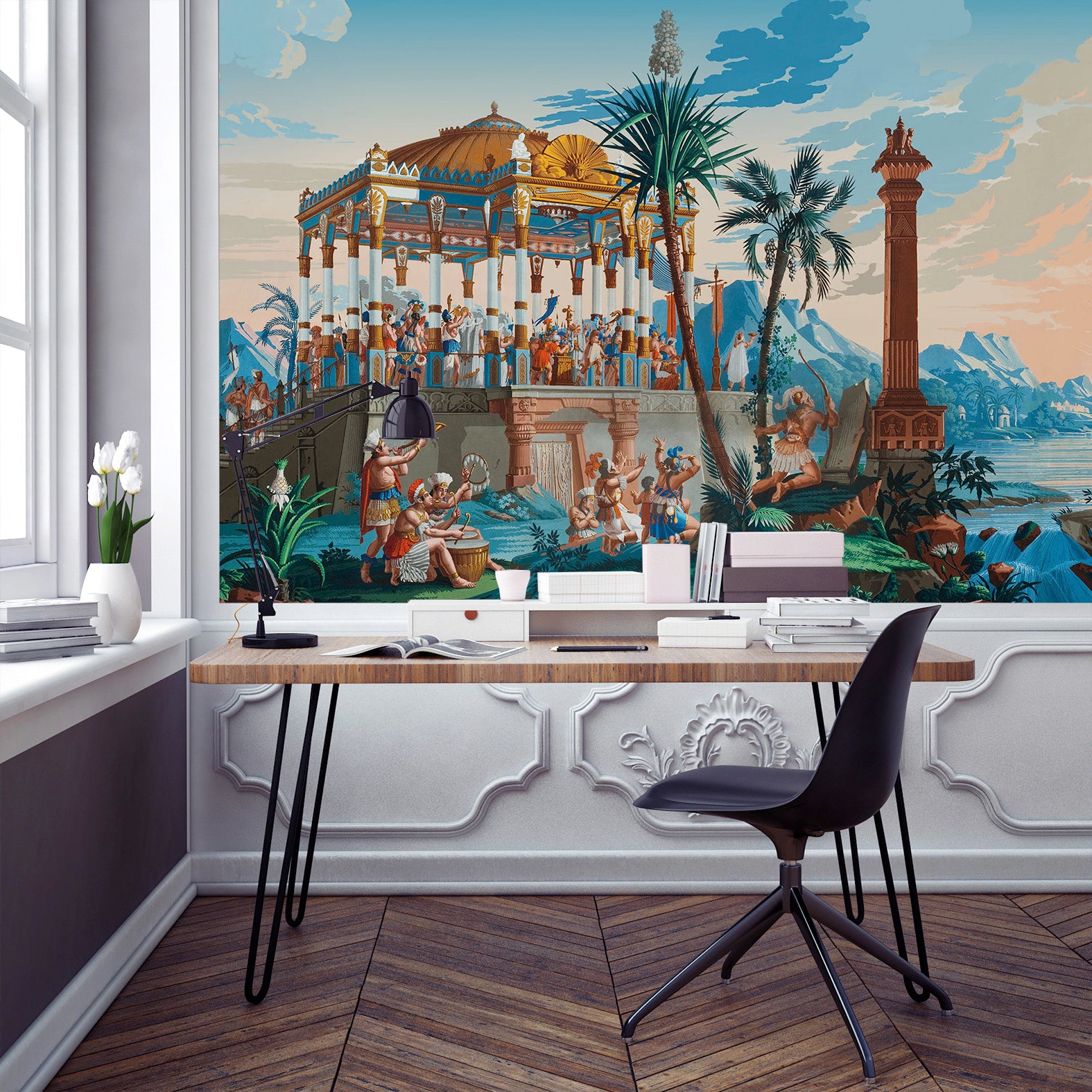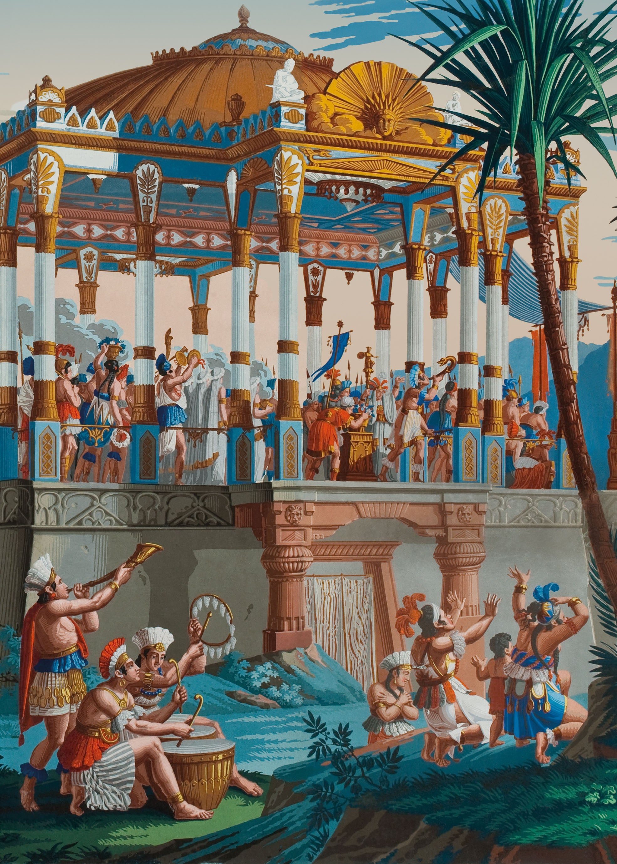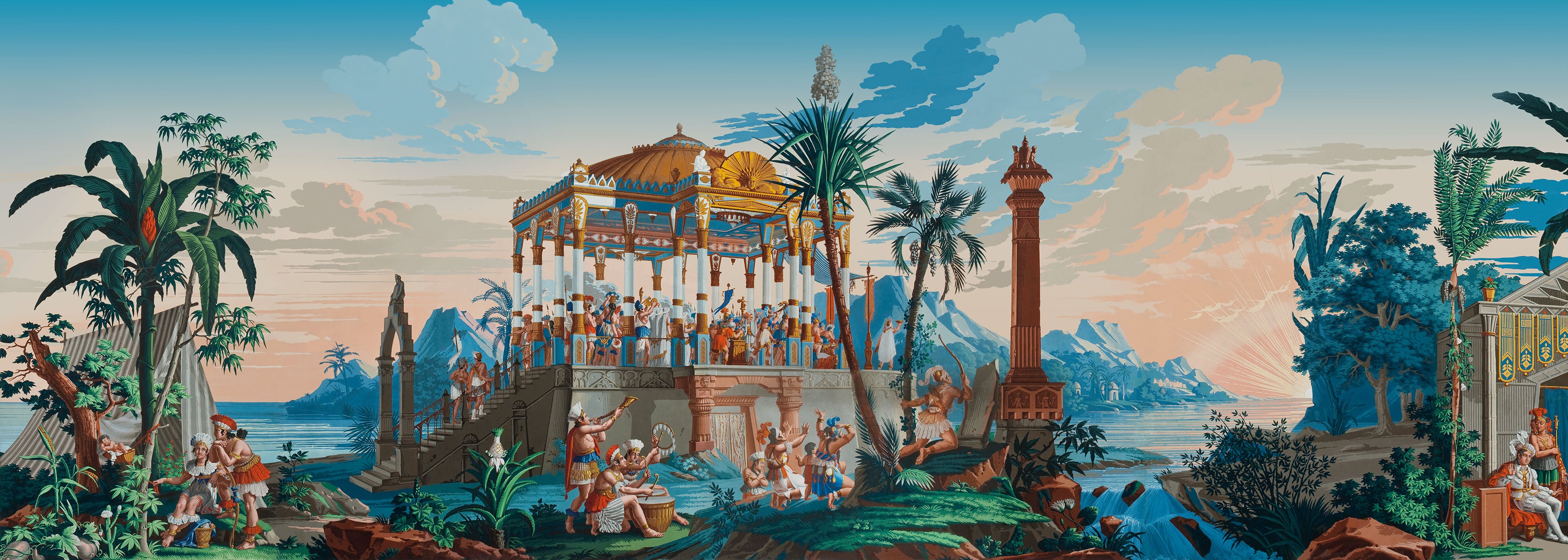 Published in 1818, this panoramic wallpaper was manufactured by Manufacture Dufour. This panoramic relates the conquest of Peru by Pizarro in the 16th century and represents, among other things, the celebration of the festival of the sun at the temple of Cuzco. The famous designer of this decor: Louis Joseph Fuchs drew his inspiration from Marmontel's novel "The Incas". the author published it in 1778 and dedicated it to the king of Sweden. The work denounces fanaticism and the “false zeal” of religion.