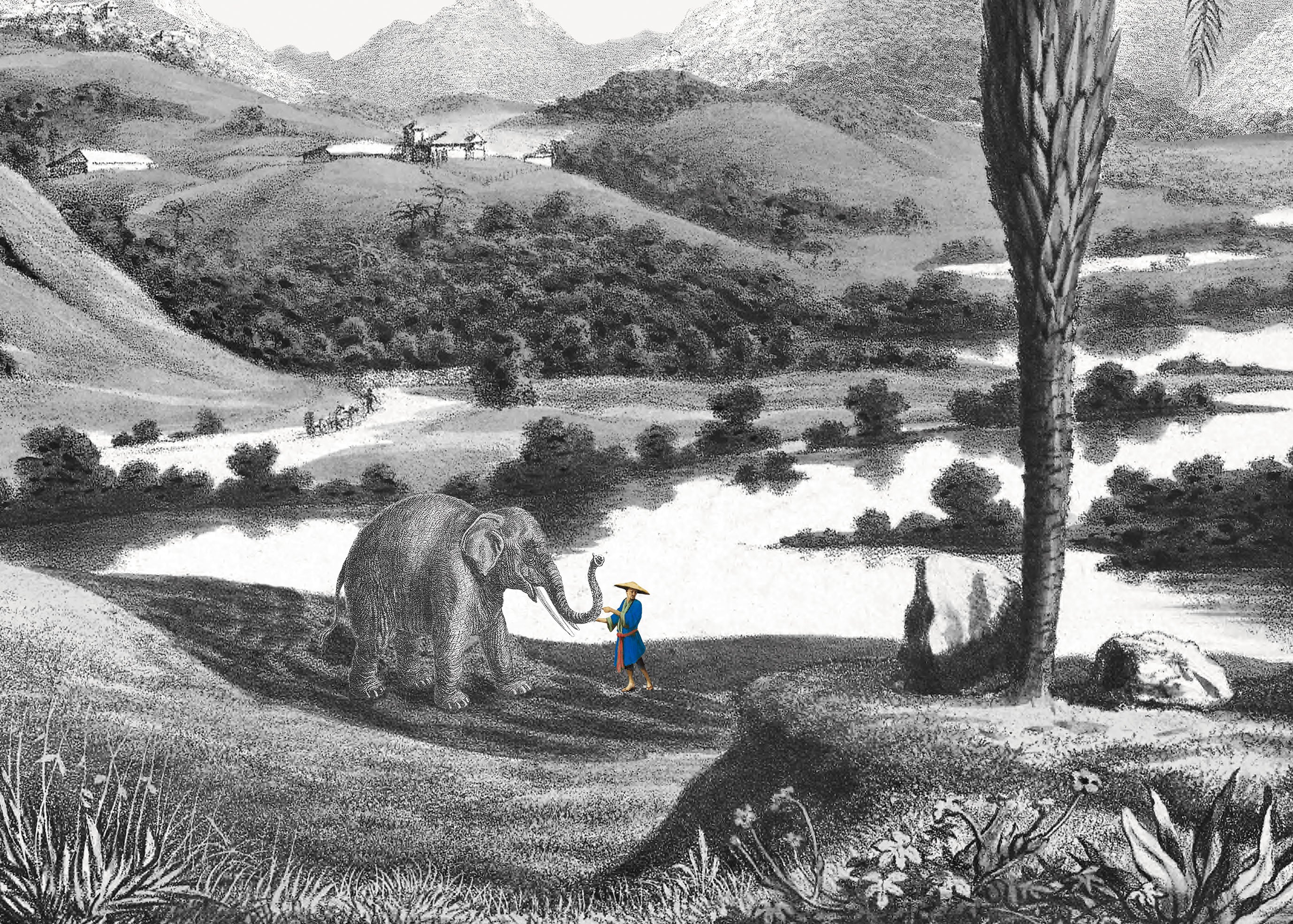 Decorated with a landscape from the end of the world, mountains and tropical forests, a small village perched on green hills overlooks the Mekong. An elephant walks on the banks of this mythical river.