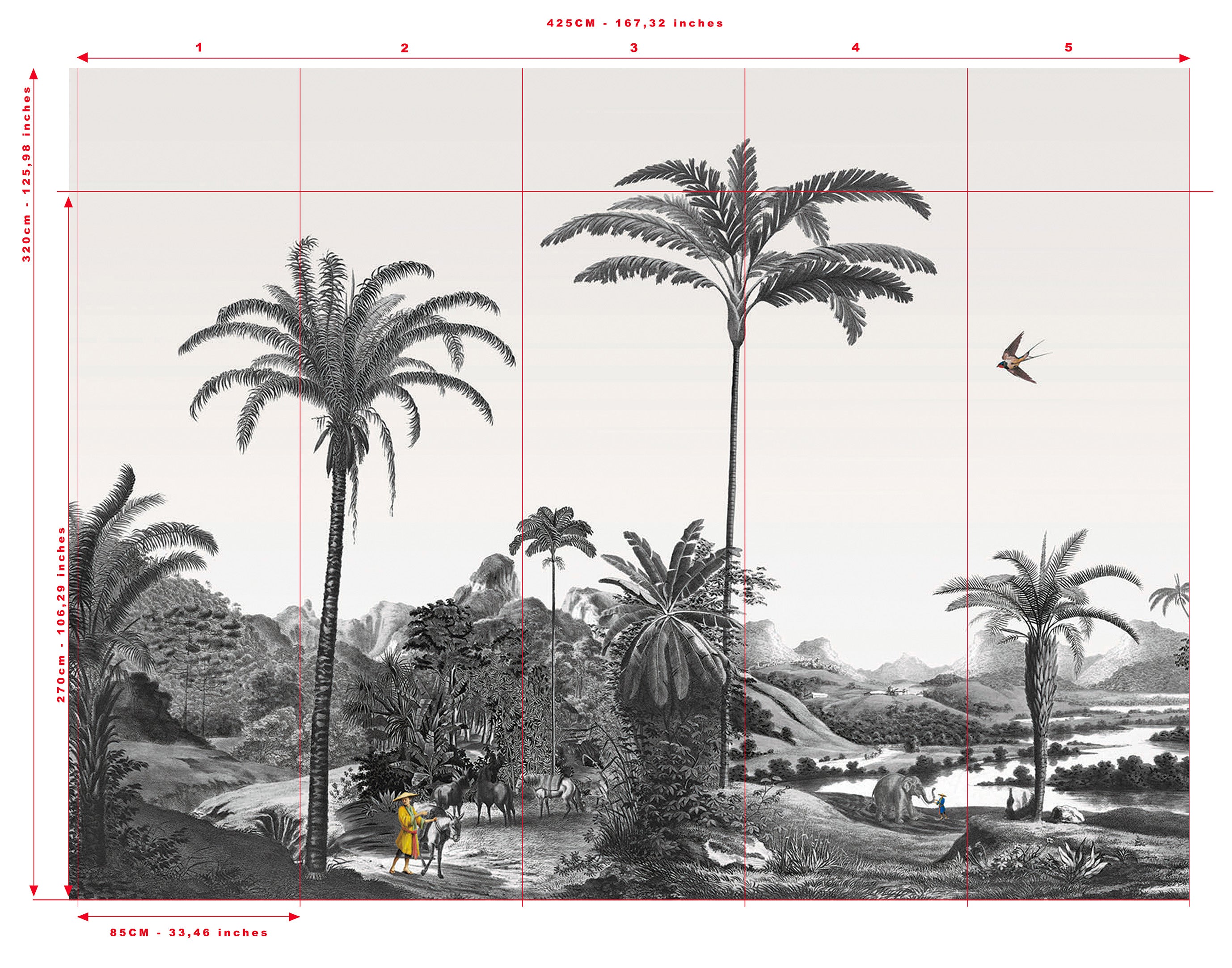 - Printed on 165 g/M2 non-woven paper (light-resistant) and sold in 85 cm wide strips measuring H.270 cm or H.320 cm.