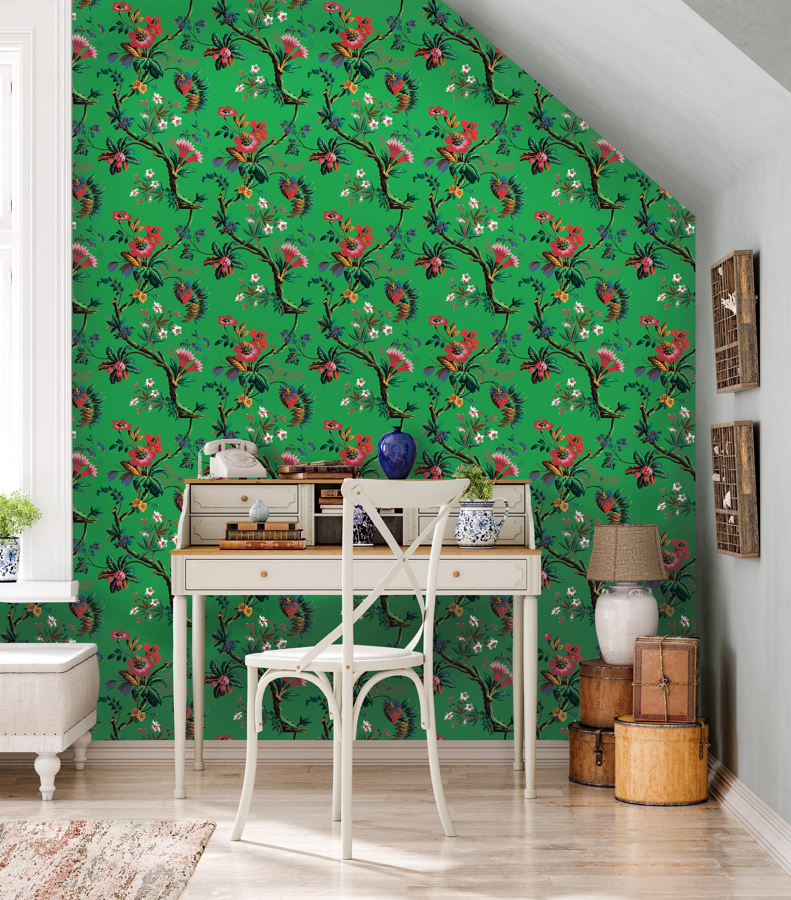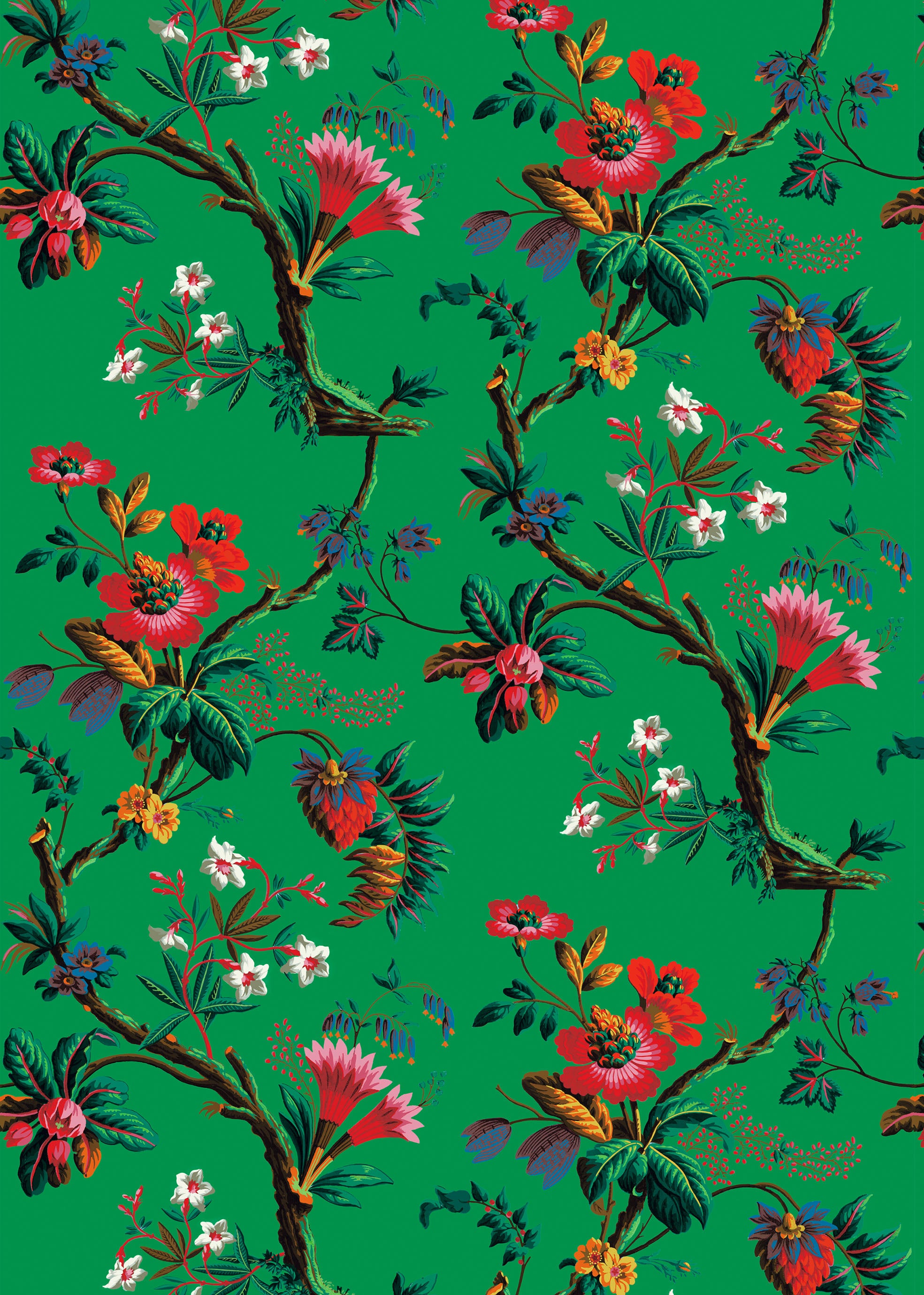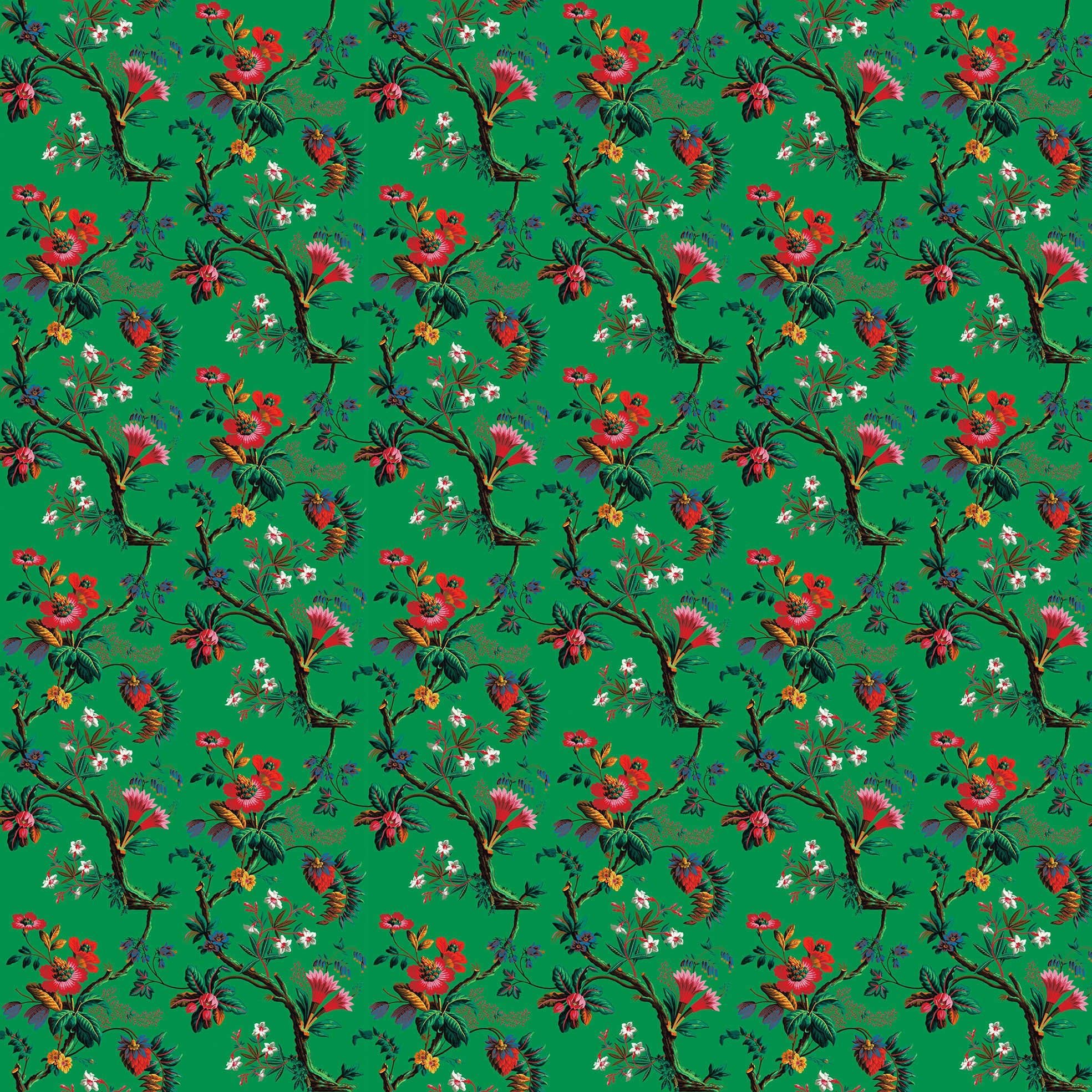 Revisiting a wallpaper dating from 1799 created and published by the JACQUEMART & BÉNARD Manufacture. It represents exotic multicolored flowers, hibiscus and giant strawberries worthy of a Jules Verne novel. The original decor was printed using engraved wooden boards reproducing more than 20 different colors.