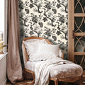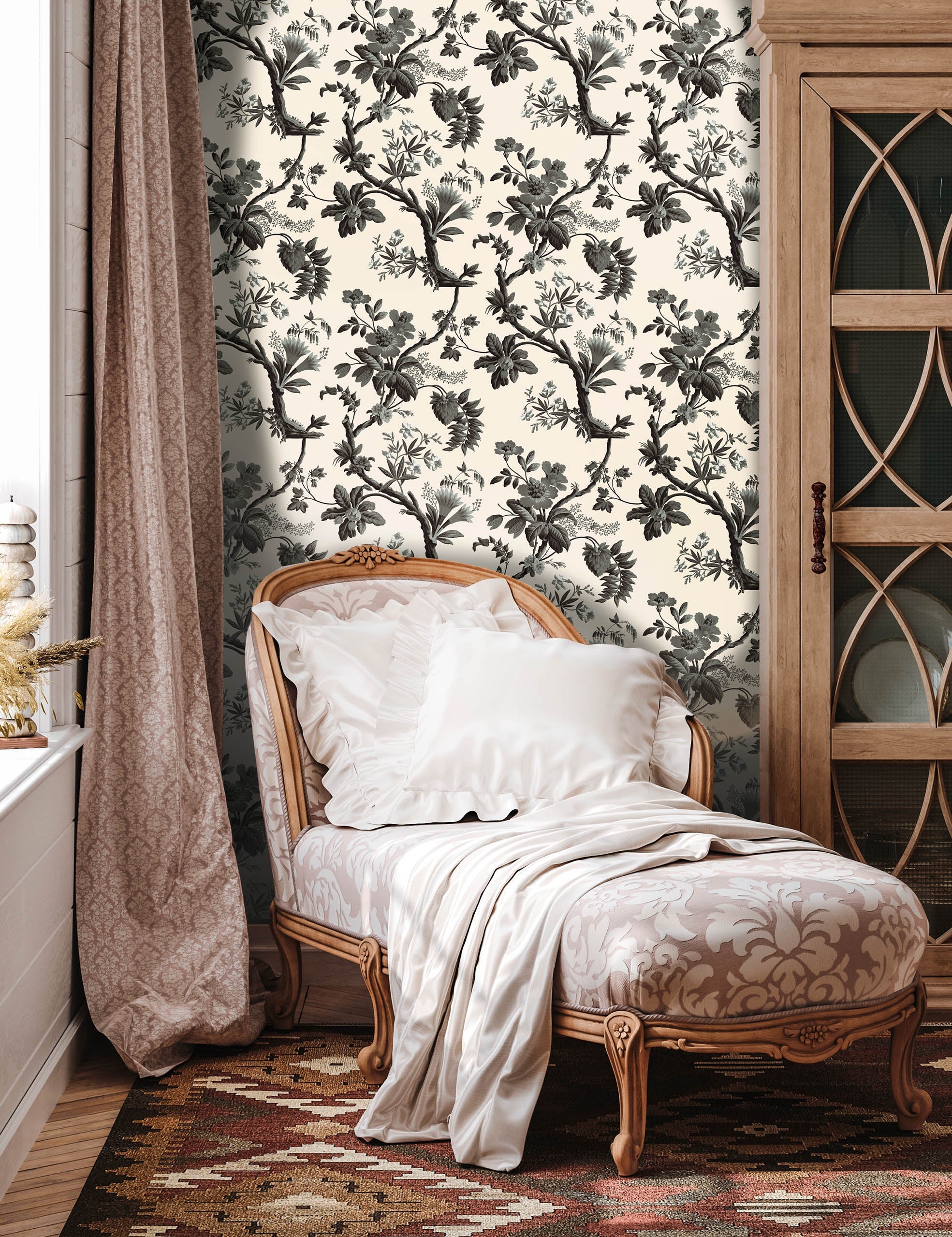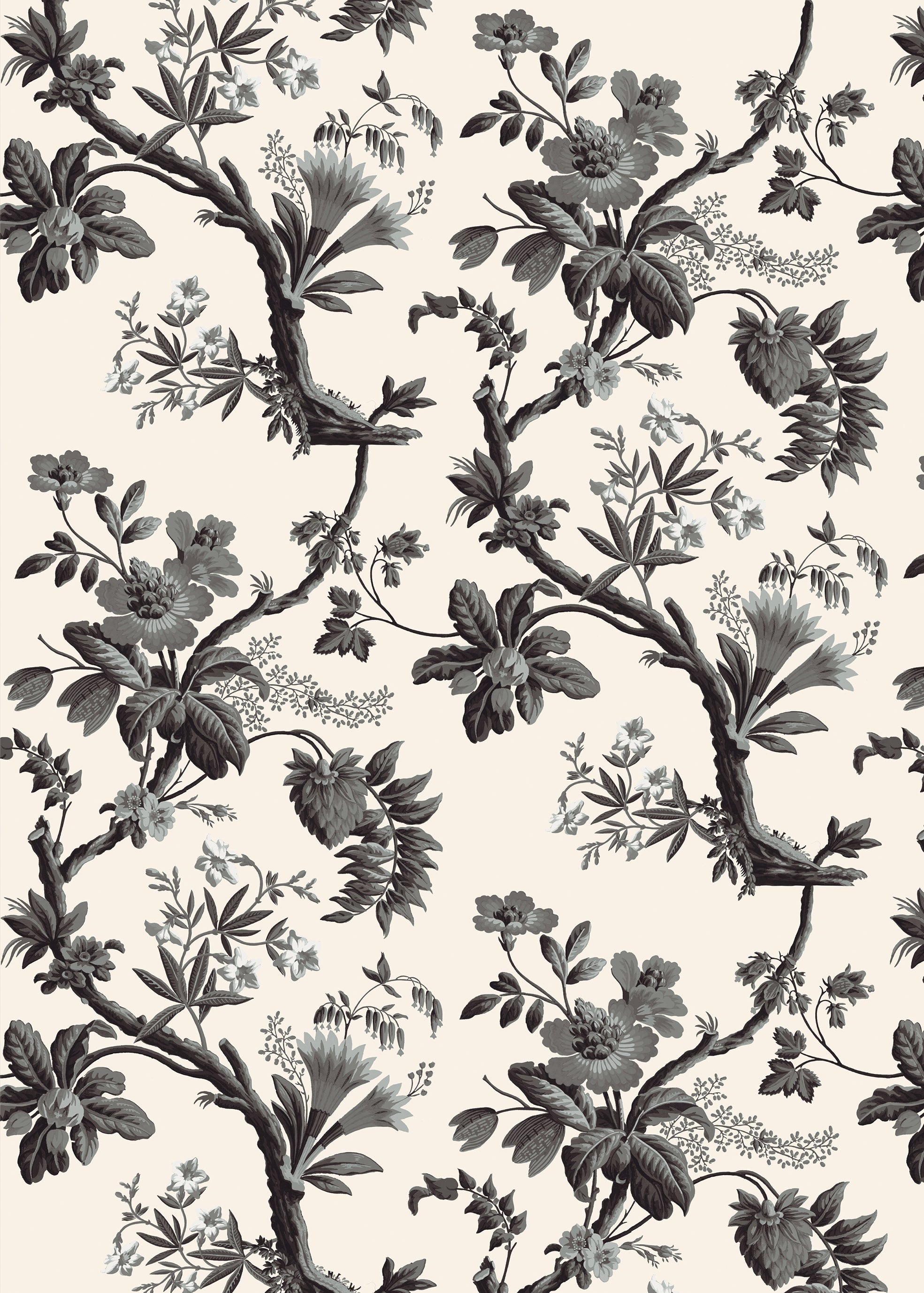 Revisiting a wallpaper dating from 1799 created and published by the JACQUEMART & BÉNARD Manufacture. It represents exotic multicolored flowers, hibiscus and giant strawberries worthy of a Jules Verne novel. The original decor was printed using engraved wooden boards reproducing more than 20 different colors.