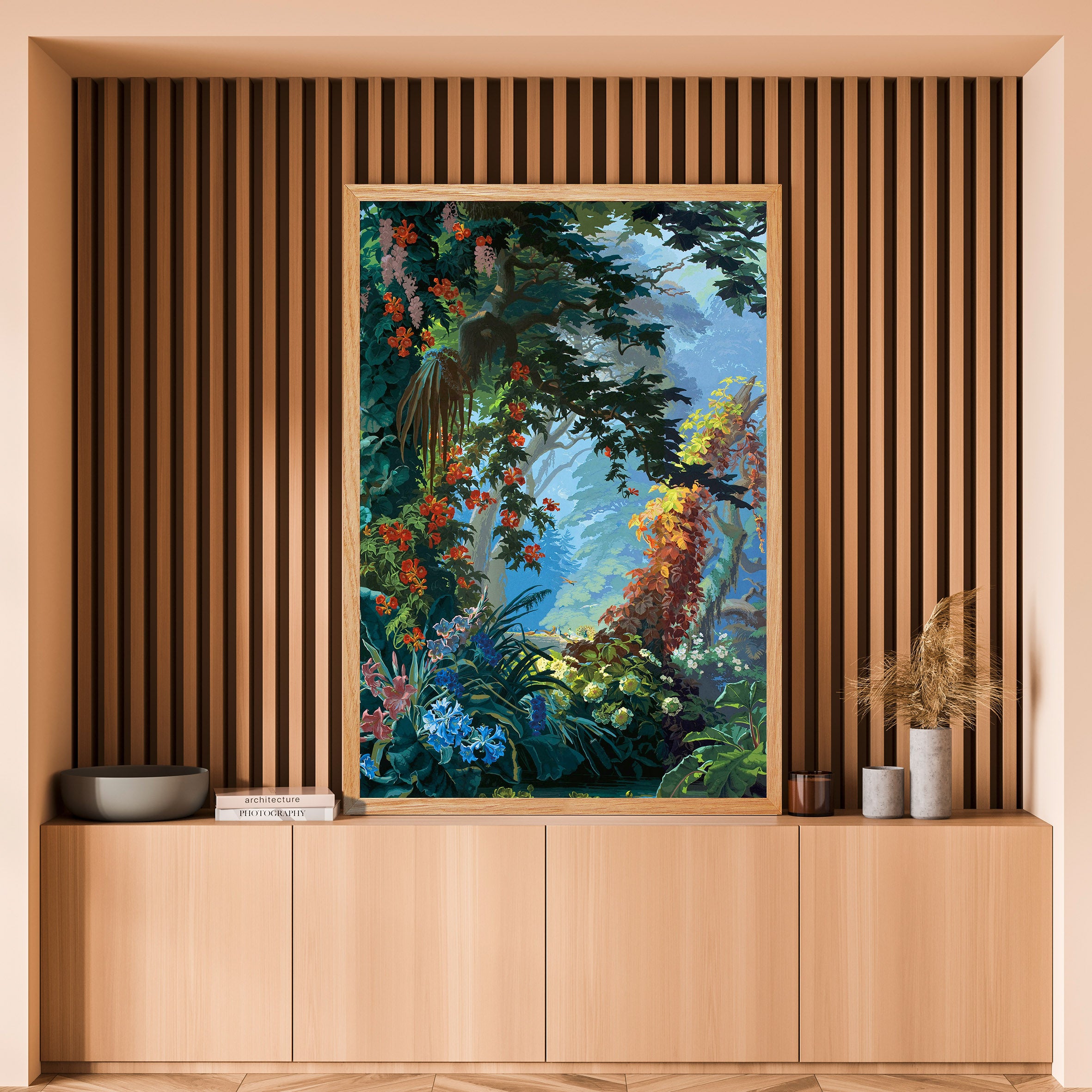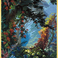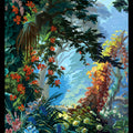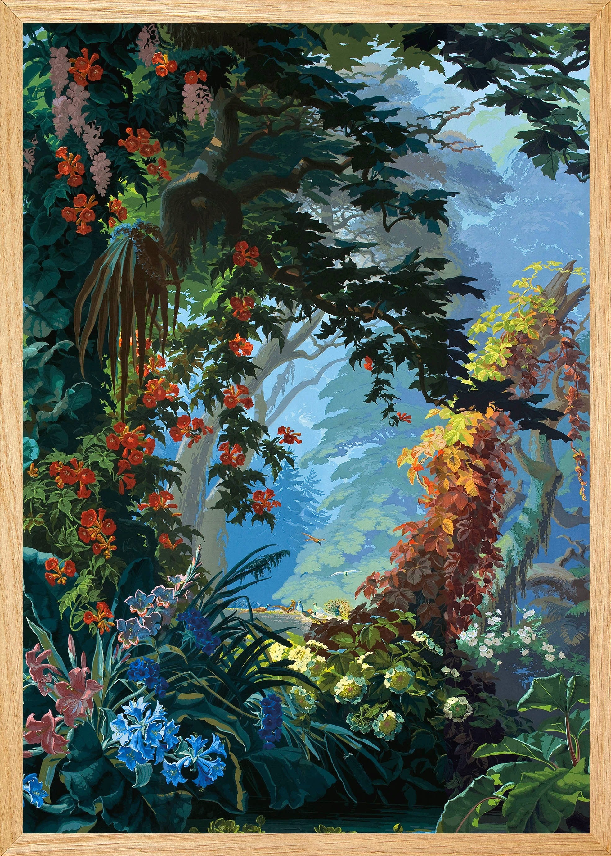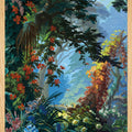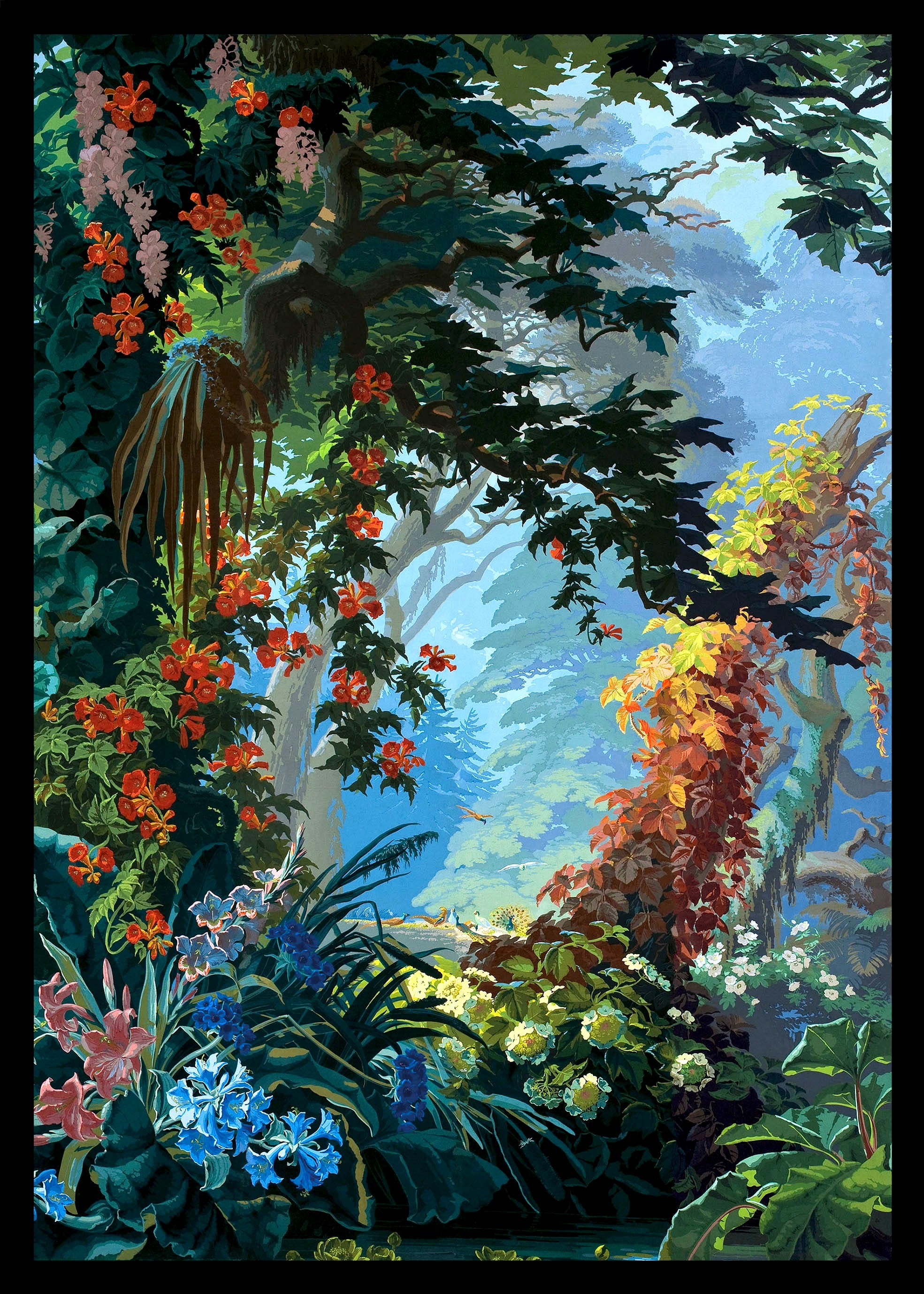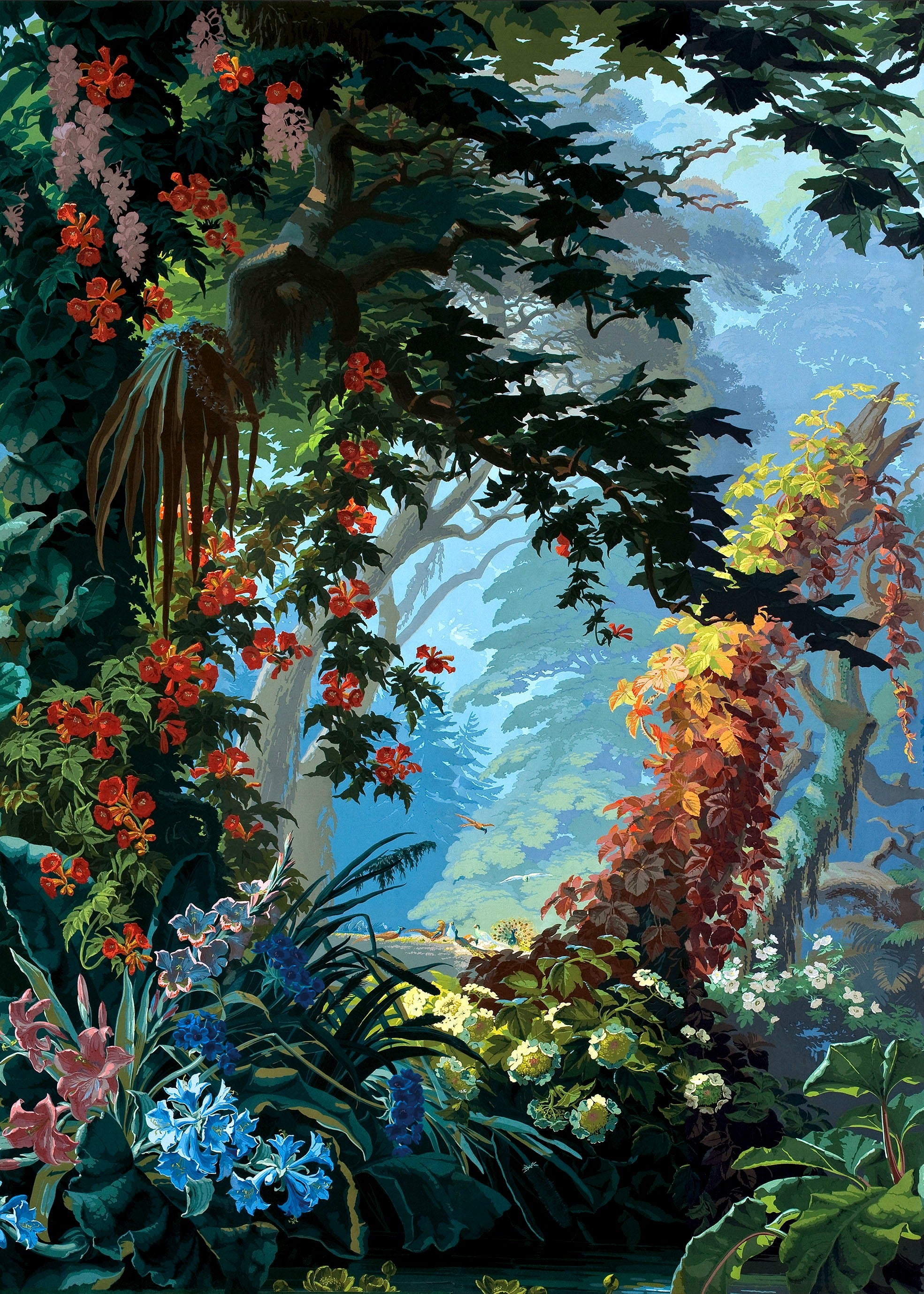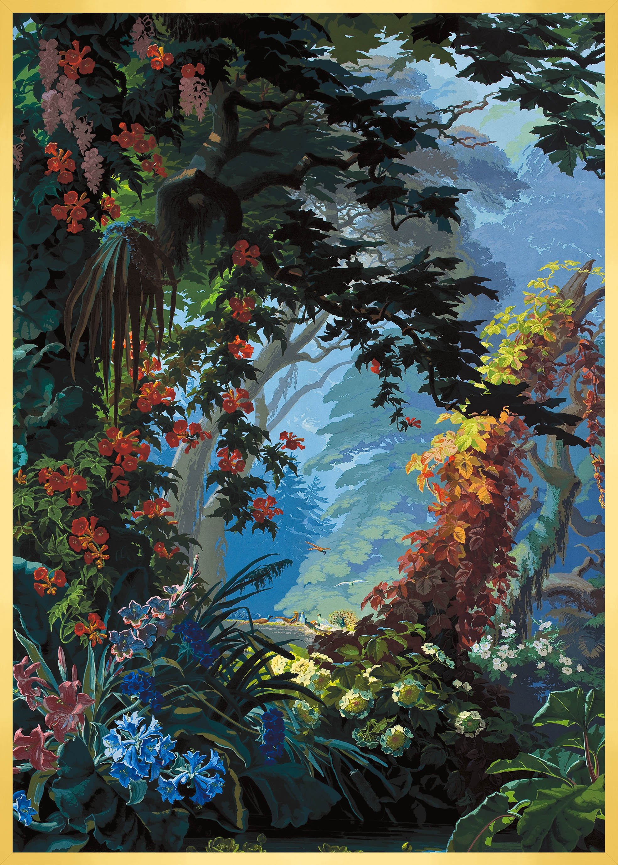 Eden lives up to its name so well. It is a heavenly setting whose fantasized representation of nature, with blue and green shades and lush landscape, dense forests, mountains, cascades of flowers and animals, responds to an idyllic vision of a time when botanical discoveries fueled the imagination. It is a representation of an earthly paradise without seasons or geographical boundaries. Plants like lily of the valley, viper bugloss, Alpine carnation, Caucasian scabiousa, Clivia, Peruvian amaryllis, Amazonian bromeliads, Indian lotus, European water lily and Japanese hydrangea, not to mention oaks, cedars and palm trees coexist in this fantastic Edenic world.