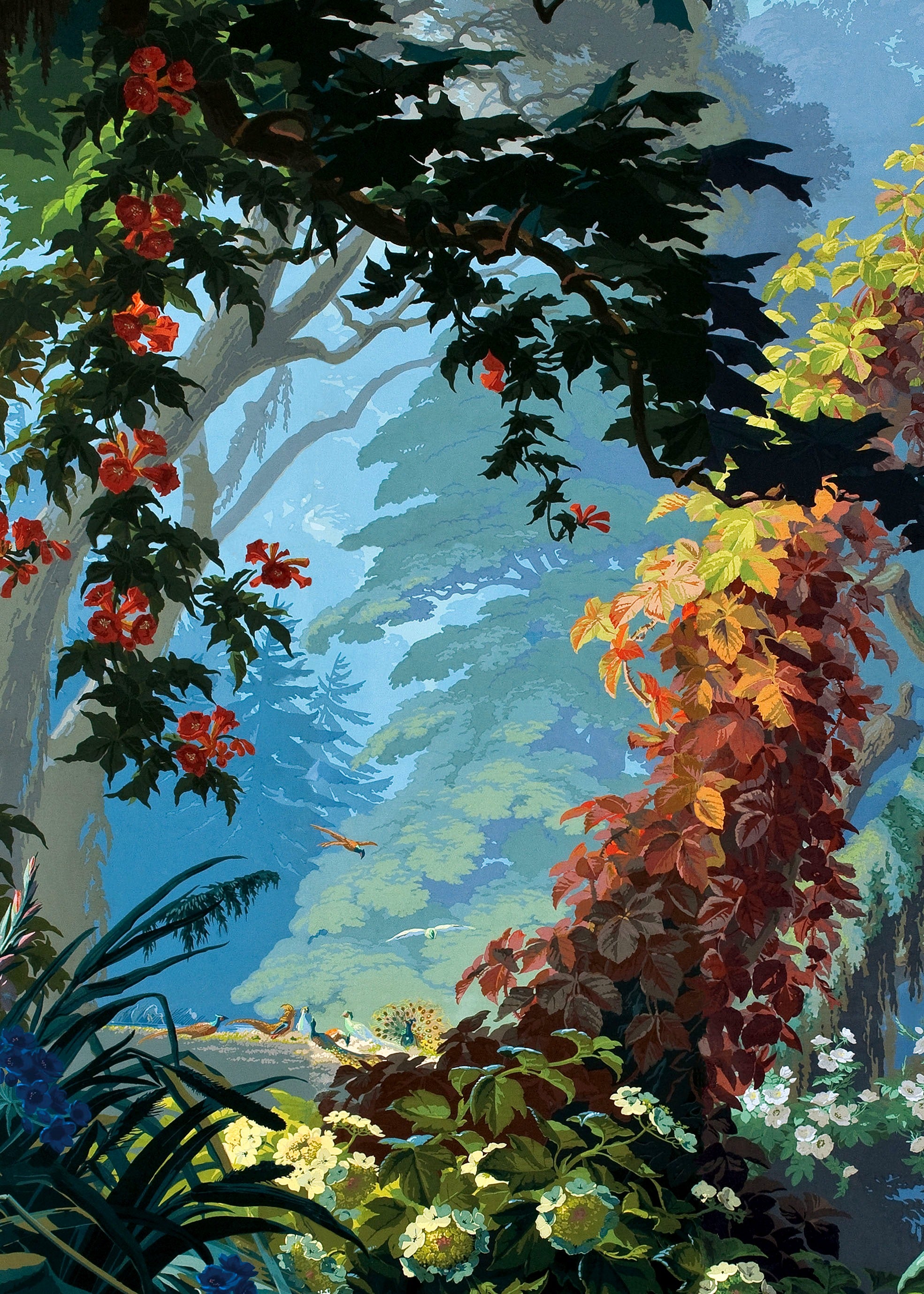 This illustration is taken from one of the most beautiful French wallpapers published in 1861 by the Manufacture Desfossé. PARADISIO IMAGINARIUM publishes illustrations from the 18th and 19th centuries which are part of the treasures of the funds of the Museum of Decorative Arts in Paris. These illustrations from French decorative historical heritage, we required hundreds of hours of reconstruction. Meticulous work allowed us to add our sensitivity to this magnificent decor by bringing new nuances and colors.