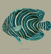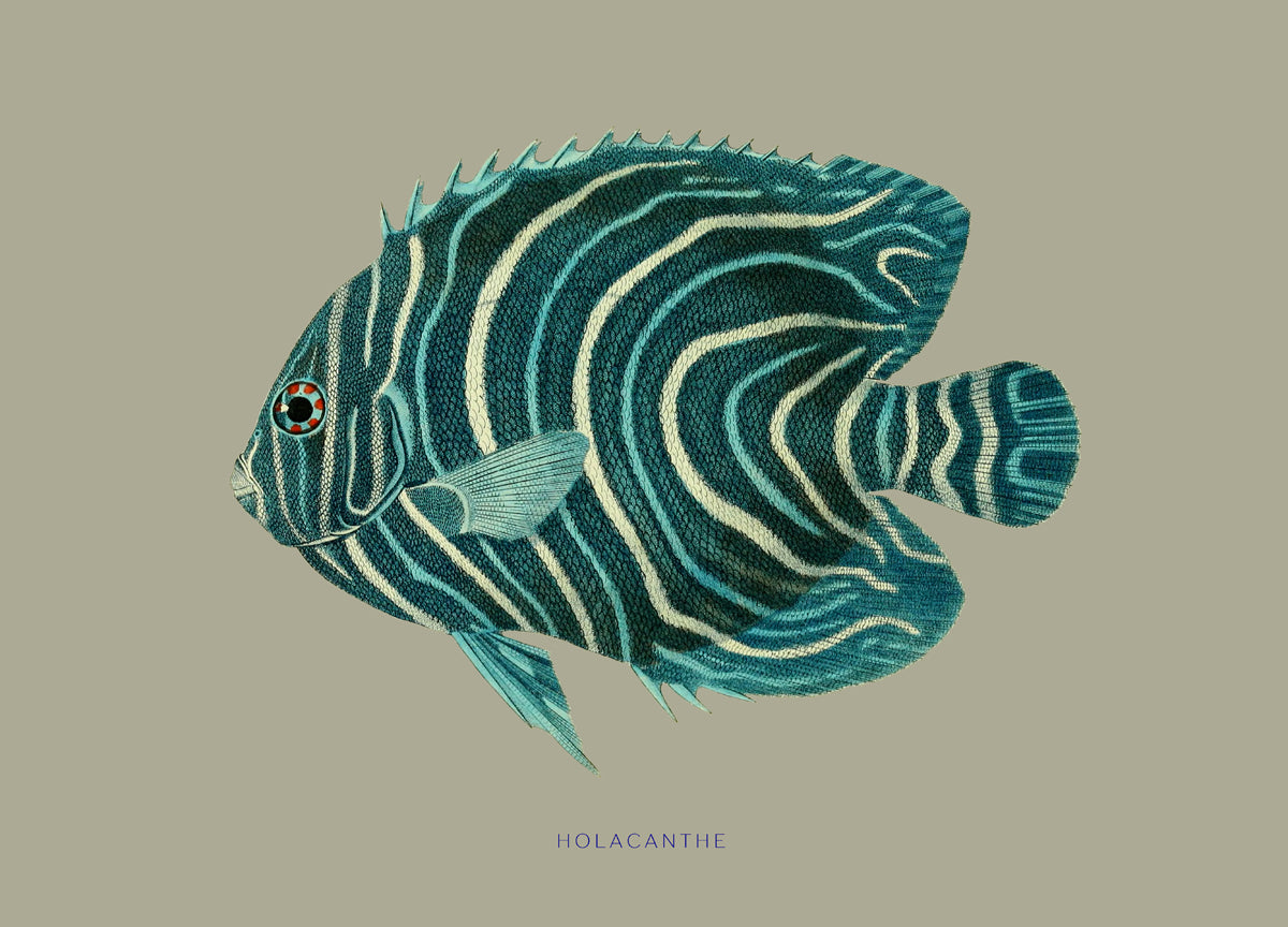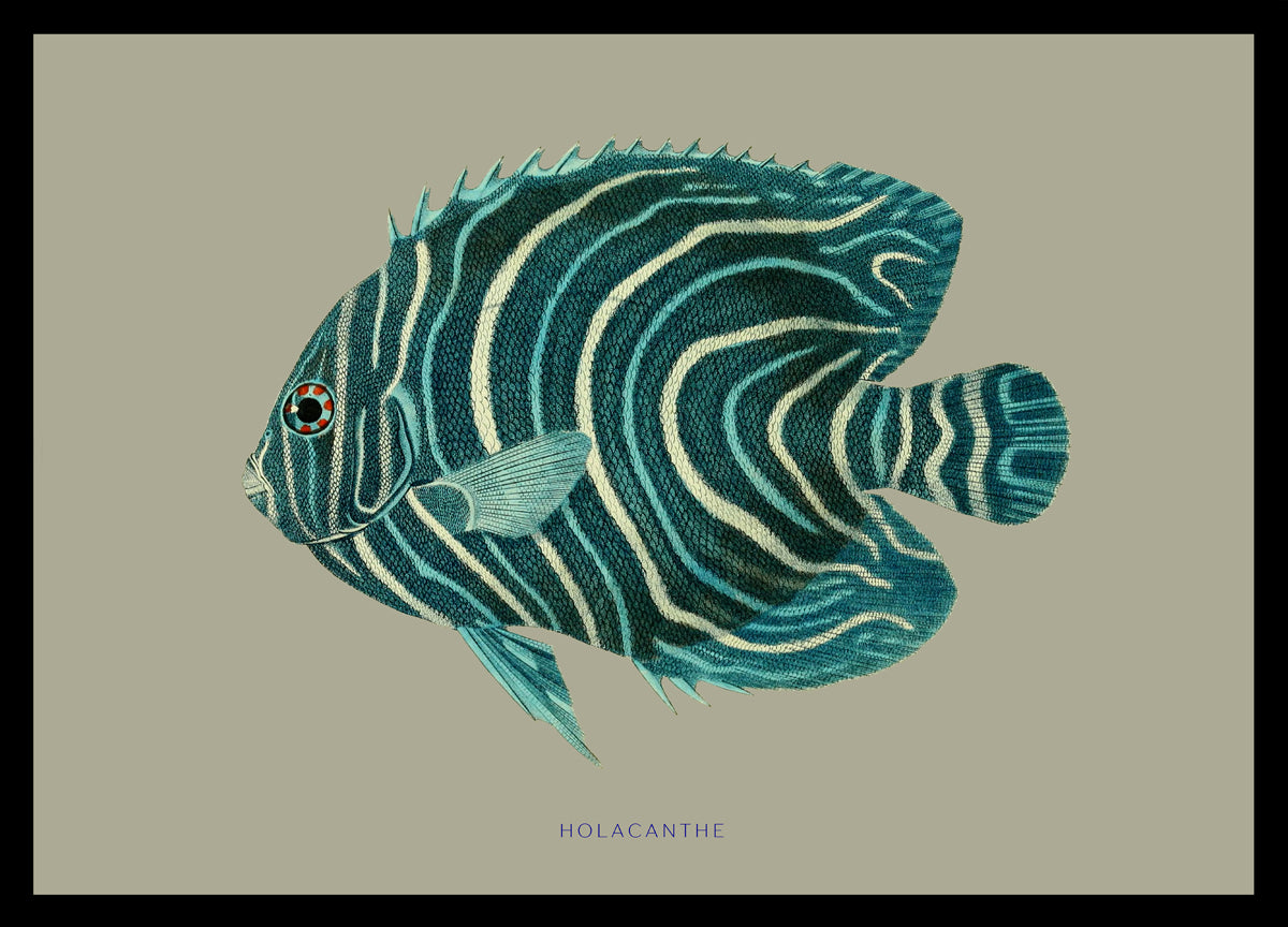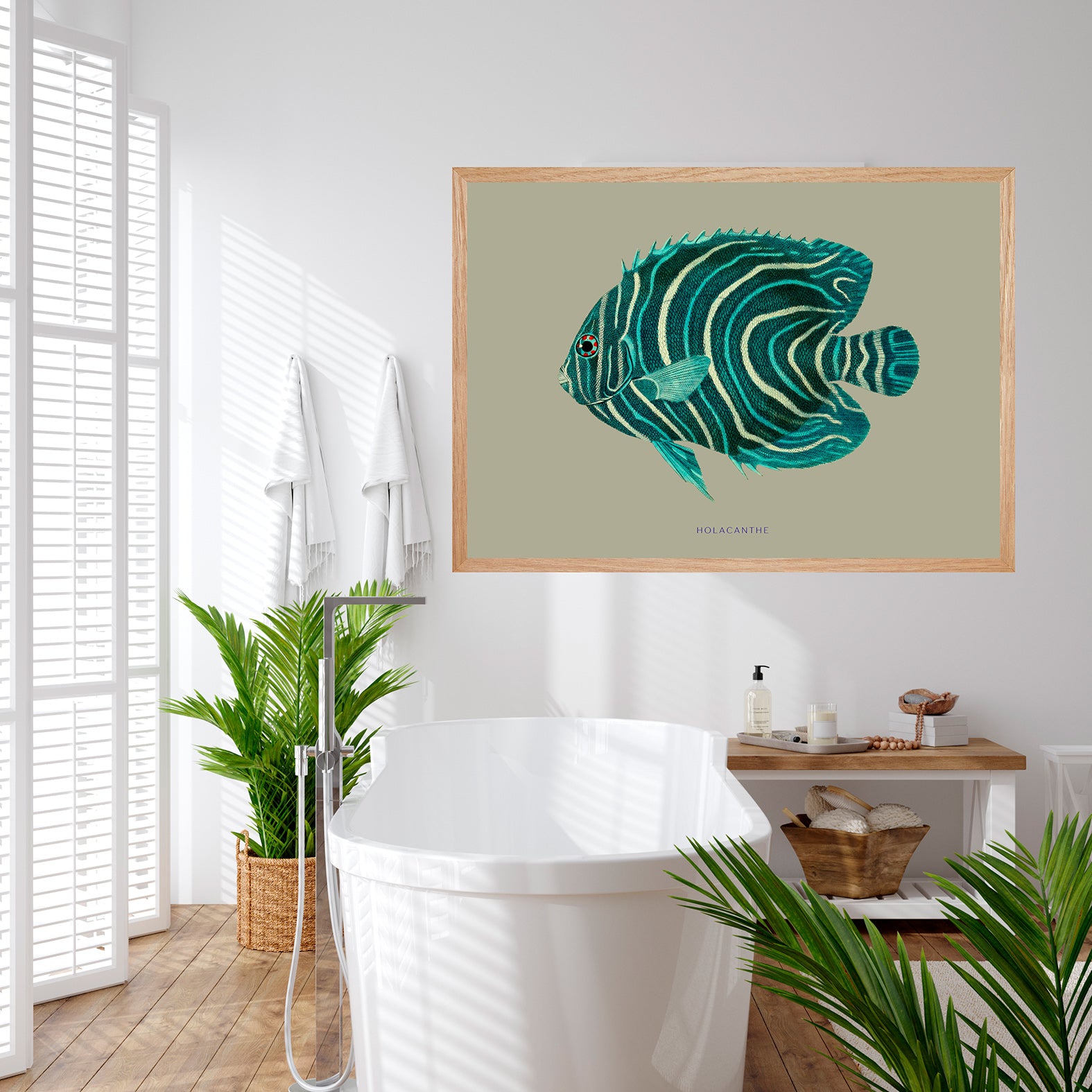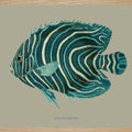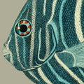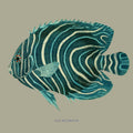 Drawing very decorative of an emerald green Triggerfish fish dotted with a very sunny yellow on a background close to Klein blue.