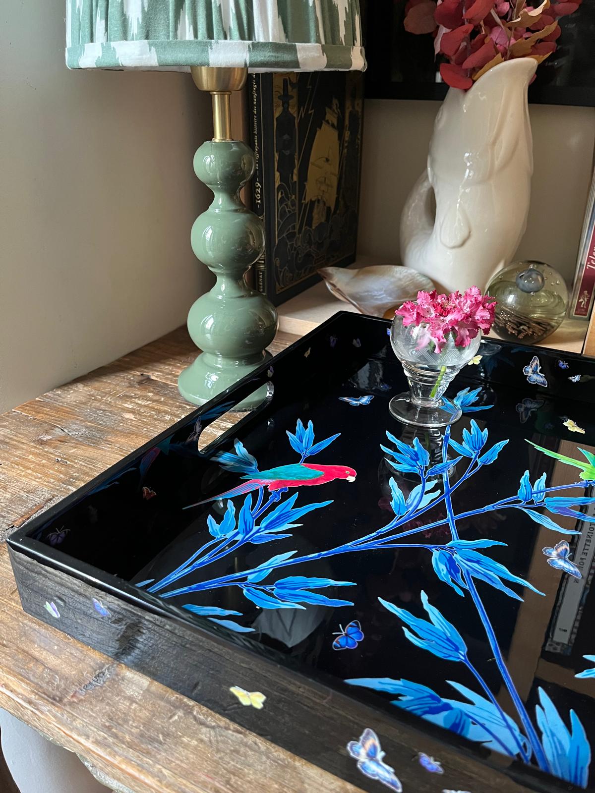 Grand plateau en laque noire " Jardin des merveilles"